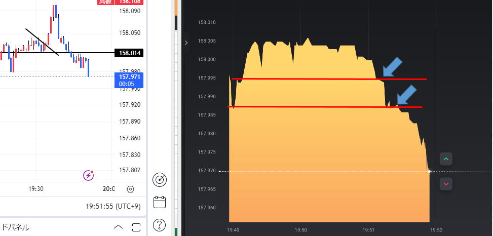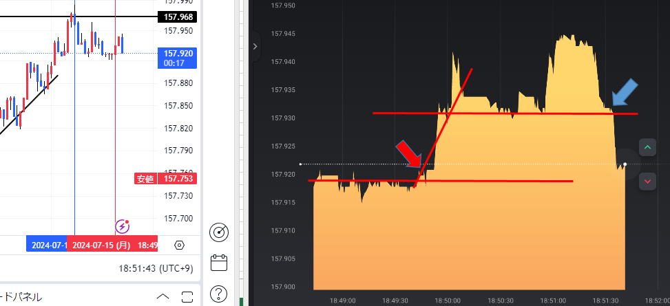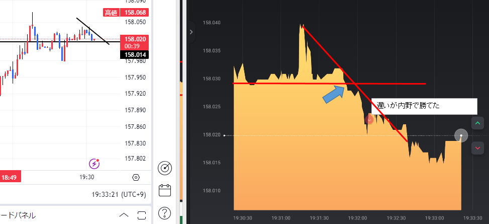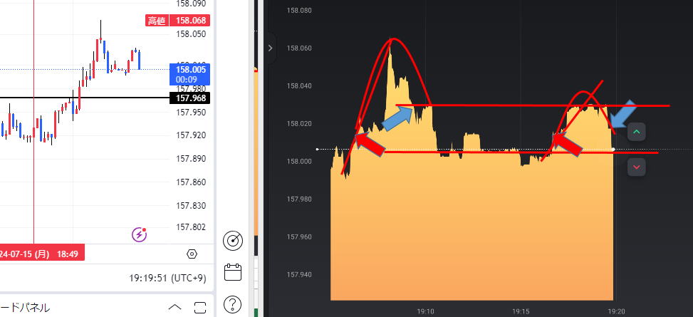 折れ線部分や階段部分でエントリー 深追いしない 二個目までにするといい反射神経が遅いと負けます。ゲームなどうまい人向けです。下がったらマウスはどっちかに決めておきます。イメージ ビットコイン15秒 マイルール通り 真ん中のエントリーはミス 遅すぎ アホです。 |