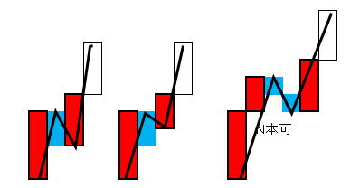 | 探す | トレンドがはっきりしているところで探してください。 差し込みの中の本数は、問いません。 上の図をイメージすると見えてきます。 リバウンドがおこる直前では、負けます。 仕掛けるポイント トレンドの方向性で見つけます。 水平線ブレイクの下あたりがお薦めです。 おおきく考えてもいいです。 |