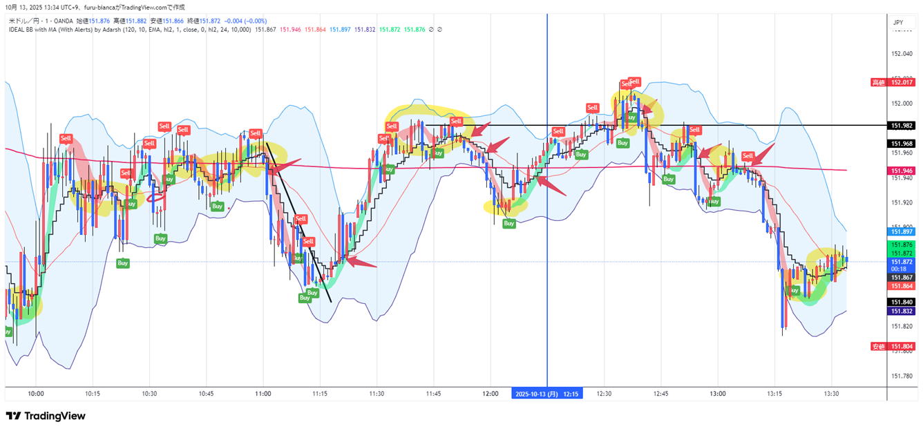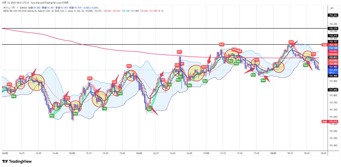 IDEAL BB with MA (With Alerts)の90%超のシグナルトレード20251031昼間 トレビューを使っていますが、有料で見てください。無料だとデータが遅れますので1分では無理があります。あくまでここは検証であり実際は20%くらいのロスになります。 パラメーター2nd lenchを6にするだけ 20251031のもので検証したら97%これはほぼ全勝 皆さんもどうぞやってみてください。 ![]() 調子に乗って逆方向エントリーも含まれました。すみません。でも勝ってしまっています。 サイン通りに次のロウソクで1分 大底なら1分3分でエントリー ほんの少しなら遅れたって大丈夫です。 サインがどのタイミングで出るのか見極めてからエントリーを検討してください。 シグナルはロウソクが確定するまで出たり消えたり出たりします。 ルール1:トレンドラインを引いてインフィールドのトレンド方向トギャクナルシグナルは無視します。 Xシルシの部分 勝てるかも知れませんがトレンドを無視してはいけません。 多分平均線3本ならパーフェクトオーダーの時は順行トレード一択 ![]() トレンドの逆のエントリーmpロウソクがうまくうねっていれば勝てますが、本日たまたまです。 下はトレンドが真横だが適当にうねっているところです。バイナリをやるには最低7本のロウソクが適当と感じています。 こんな場所時は1分エントリー一回にしてください。 ![]() 20251031 16:59 7シグナルの次をエントリーしたら6勝でした すごいの一言。![]() けっこう当たります。 ルール2:エントリー時間は、基本1分 1分と3分の併用は前回のロウソクが10本程度あればです。 トレンドと同じ方向であれば1分3分同時エントリー 慣れればですが 慣れないなら2連打 ルール3:反復はバンドウォークが短い時は、1分か30秒エントリー ルール4:ゼブラトレンド 赤青が交互に出る場所は信号が出ないと思いますが万一でても無視してください。 信号が出るまで待ちくたびれます。 そこで 信号はその場だけじゃなく、それ以後の目線を教えてくれるので、トレンドに乗れれば乗ります。 どこでやってもいいというわけではありません。 ![]() 左側なら一分でエントリーすれば7連勝一敗ですが右側は2勝一敗後、エントリーに困ります。手を出せば負けます。 ちょっと感の良い人なら3分エントリーで押し目を吸収して乗り越えるでしょう。 ダウ理論んお世話様です。水平線ならブレイクで二回エントリーできます。根拠の切り口は知っていた方が良い。 もしトレンドならうねりもあります。チャネルの端っこタッチエントリーするか、陽線陰線を追随するエントリーかは様子を見て決めてください。 簡単なエントリー根拠でトレンドラインブレイク ❶トレンドラインブレイク むずいのは、二本目をしとめることです。一本目でブレイクって分かったらブレイクだって行っていないで即反転エントリー 最終ろうそくを抜けるのが基本ですが、続くかどうかは分かりませんがトレンドと同じ方向なら連続性が高くなります。 ❷水平線ブレイク 王道です。 パーフェクトオーダー めったに出ませんが、レンジの後によく出ます。短いレンジはトレンドの中腹にまるで休みのように見えますが出来高が増えますと ![]() 売り買いが激しくバトルし、その後方向性のあるトレンドになるもんです。 トレンドラインを自由に引いてみましょう。決まりはないです。ただ2点の接点は効いてるって感じがします。 覚えておくと良いのはゼブラトレンドです。ここでみんなこの泥沼にまっちゃうんです。 ![]() どっちも同じチャートですが左は、何気なく上がって見えて、右はは中腹でレンジ形成。ここで陽線で1分エントリーしたら死にます。 ➌N型И型は水平線と同じ N Nの反対のИ![]() これはなかなか、気づかないもんです。けっこう鉄板です。80%は行けます。 W底M天井などのロウソクのトリックやその他いろいろあります。お任せします。何かあれば教えてください。 FXでも使えます。 FXなら損切ラインは信号の場所にして決めておけば、多少バタつきがあっても見ていればいいだけです。 仮にBUYサインならHighエントリーしてSELLサインで決済でいいです。 ドカンがないことを祈ります。 寄り道しました。すみません |