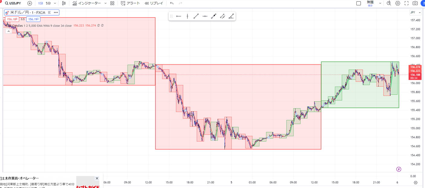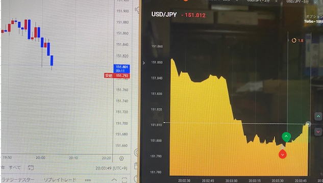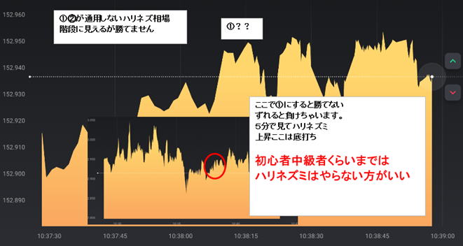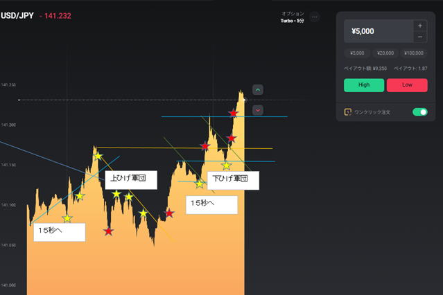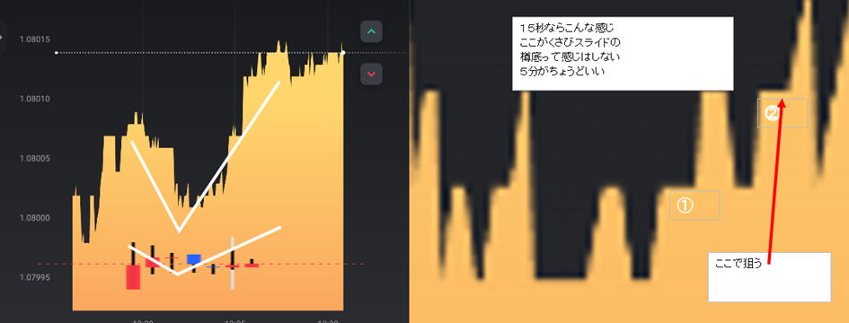 | ダメなのは | 遅いということです。15秒は2秒位のチャンスしかないので考えず、エントリーそれでも迷ったら 30秒1分3分のラインチャートを出して環境認識します。どこかにラインが見えてきます。 中途半端なくさび狙い くさびは狙ってエントリーしませんとそこでエントリーできません。よってくさびは無視します。 ただフラットな相場が出ればくさびが出たらエントリーしてやろうとなりますが、まあ約定拒否になって外れた場所でエントリーが関の山で失敗します。 それより安全性の高い場所でエントリーしましょう。 くさびが横ずれかちょっと上がったらエントリーできます。0.5秒判断で反射的スキルが求められます。慣れないと無理ですかね。 されど、人間の要望が深いので、フラットになったらくさび待ちでHighLowを予測してタイミングよくエントリーしてください。負けそうになれば 反対に連続で二発エントリーしてください。この手法はお薦めしません。反対も負けると3発負け なんでもかんでも15秒も良いですが環境認識できたラインチャートでエントリーしてください。 ![]() 過去検証コアタイム以外の時間 ボラが3くらいじゃないと階段が3段階にならないので注意 細かいロウソクが連続していると意外と勝てます。 ![]() ![]() コアタイムでやってください。 レンジトレンド相場 ![]() ![]() レンジっぽい場所で00で始まった流れは40秒で反発があるので注意してください。ひげがそれに当たります。 よっぽど慣れないと時間00まで見れないと思いますが、 完全レンジ 二段階を待っていたんじゃ勝てませんので初動の一段目でエントリーするしかないです。プロでも難しい ただひげがあればあれば次の動きは順行するんですが滑ったら地獄で負けるんです。 瞬間的にタイミングを考えて3分から1分に変えてみてください。。長いと戻って負けます。勝っても50%でこれでも良い方です 職人技のある方ならこのように勝つでしょうが、 まあレンジは抜けるまで待つのが基本です。静見するしかないです。 ![]() |