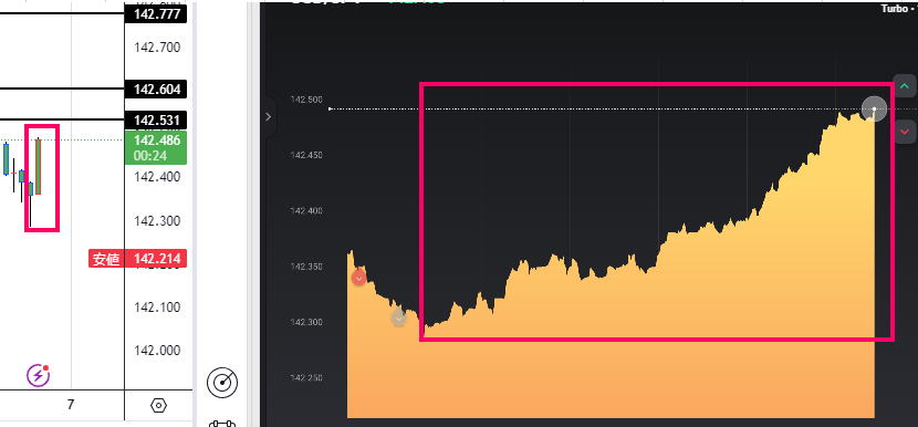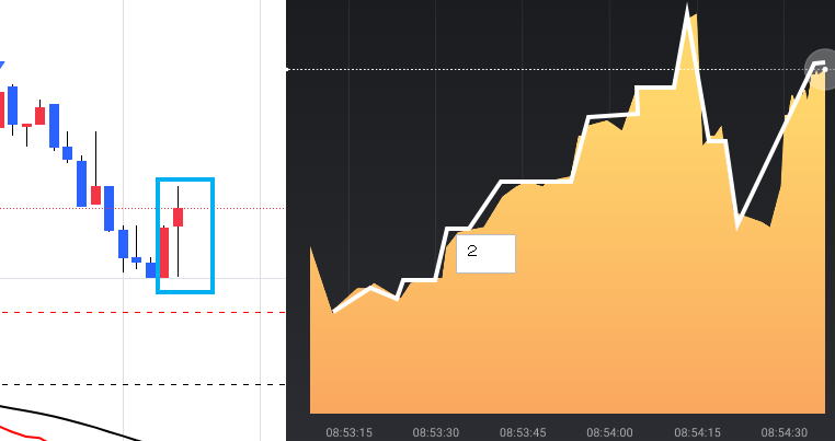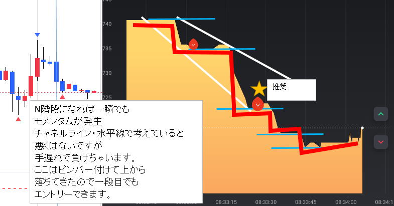 安値高値の位置関係で階段が出たら N型になった瞬間である二段目を狙い、ここでエントリー トレンドがはっきりしていれば1段目で狙ってもいけます。 ![]() 一段目では、下げ上げでは分からないので二段目になる。 3段目が順行する確率は絶大です。 三段目では、利食いの反発があるので止める。 ペッタンコになったらリセットして次の階段の出没を待ち、二段目でエントリー 下記は5分ライン真ん中がリセット ![]() 20:47分でペッタンコ リセット 20:56でペッタンコでリセット ラインチャートではどんと落ちたがこの後はうなぎ上り慣れれば一般チャートを見ないでも行けそうな ![]() 反転の瞬間 ![]() ばたばたしていると負けます。坊主ロウソクが良いのですがそれを予測する術はないですが、階段になっていればほぼ坊主 ひげが一般チャートで上下に出れば不安定なのでラインチャートでも勝てません。 階段途中にブレで負けますが、フラットリセットして次の二段目を待ちましょう。 そのうちドル箱相場が来ますのでそこで取り返しましょう。 レンジでもできますが雰囲気をつかめば勝てますが連打不可です。 ![]() ![]() ![]() ![]() ロウソクでひげが出て順行しそうなら、階段が出ますので基本通り二段目で15秒Highエントリー 横滑りが10秒以上続きそうな時は、小さなブレで負けます。勝てませんので静止するしかないです。5分はエントリーどころじゃない。 駒が連続する時も同じで階段待ちです。 フラットの形より少し激しくなりますとくさび型で動きます。フラット階段と同じ原理で、この相場はフラットより強く長続きします。 もし1分チャートなら、2倍はエントリーしちゃっていると思います。 15秒なら連打しまくりかな。 ![]() ![]() |