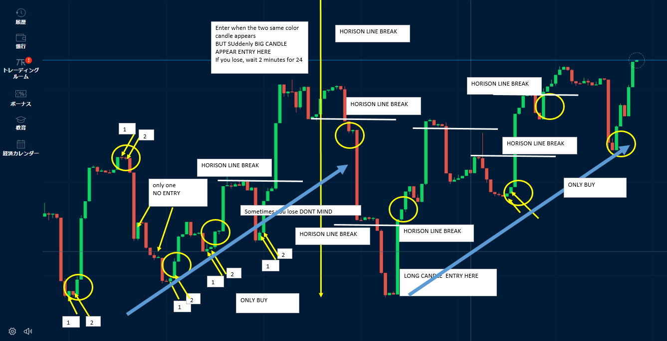 階段① 階段⓶のエントリー 画面を見てラインチャートが階段状になっている時だけ有効です。なだらかな半月円のようなゲレンデなら最高で連打しても良いです。 水平ラインから階段状に進むと平らなところができる。V字でもOK これを①としさらにその次のの階段⓶で15秒エントリーします。 ラインが逆行したらリセットします。または水平に10秒動いてもリセットして⓪に戻ります。そこから①⓶として⓶でエントリーしていきます。 ⓪と①と⓶は、ダウブレイクして水平線で引くと落差があるのが条件です。 まあ、難しく考えないで、順階段になっていればOK 上げも下げも同じです。 ③もあるのですが、反発でよく負けるので③ではエントリーしません。1分でもバタつきがないなら誰でも①⓶で勝てます。 バタつきがある相場では①が出ても⓶が出ません。 ③でも④でも勝てそうですが、きれいにゲレンデみたいになっていればエントリーしても勝てそうです ![]() これはまだいい方です。上に膨らんだブレでエントリーしてください。下がってつられてエントリーしますと負けます。ロウソクチャートは上ひげから始まる陰線の連続 上ひげ陰線で次も陰線なら代チャンスと言えます。 こんな感じの階段が出れば万歳です。いつ来るかは分かりませんがあせって連打しないでください。 連打をするなら先にエントリー 後からの連打は70%負けるんです。連打しようという気持ちって最後にでるすけべ根性のような物です エントリーマークは検証用イメージ本物は一個あります。 30秒エントリーです。反発が大きい山なので15秒じゃ負けそうです。15秒でやっていると30秒は遅いと感じます。 上くさびを狙うんですが、Λのピークで狙うのは不可能なので上に行ったらLowエントリーします。そのまま上に行けば逆噴射2発して 負けを取り戻せばいいです。 じっと見てるんじゃなくリラックスして同化してエントリー 練習しても難しいです。 チャンス降臨左側 調子こいてエントリーするとΛで負けます。 上昇トレンドだと⓶から伸びる 。![]() ![]() 15秒10秒だけの神降臨 大きく行ってしまった場合はエントリーは、①でエントリーすべきですが、時間的反応時間的に無理なのでパスします。 エントリーしちゃいけません。 ![]() 下記のような大きなぶっちぎりのくさびになれば⓶でエントリーはできないってわかると思います。瞬間反発で反応できないです。 ![]() ![]() 実戦で使えない無理な検証はしません。 ![]() 階段になっていないのでダメです勝てません ![]() ハリネズミ 5分だと階段のようにも見えますがハリネズミですね。エントリーポイントの見つけ方 5分で見てパターンを見つければ後は30秒や15秒に移って目標ポイントまで我慢して①⓶でエントリー 左5分見て右15秒や1分でエントリーしていきます。大きいぶれから①⓶がありますね。 上下ヒゲ 00から下降し、15秒でリバウンド 通常の3倍の下落のあとリバウンドして来たら即エントリーすると勝てます。 ![]() |