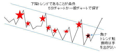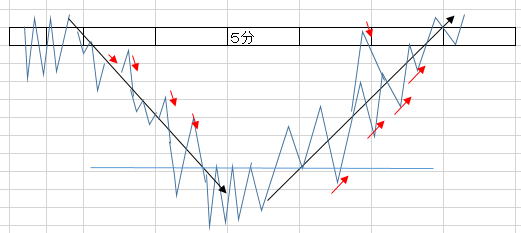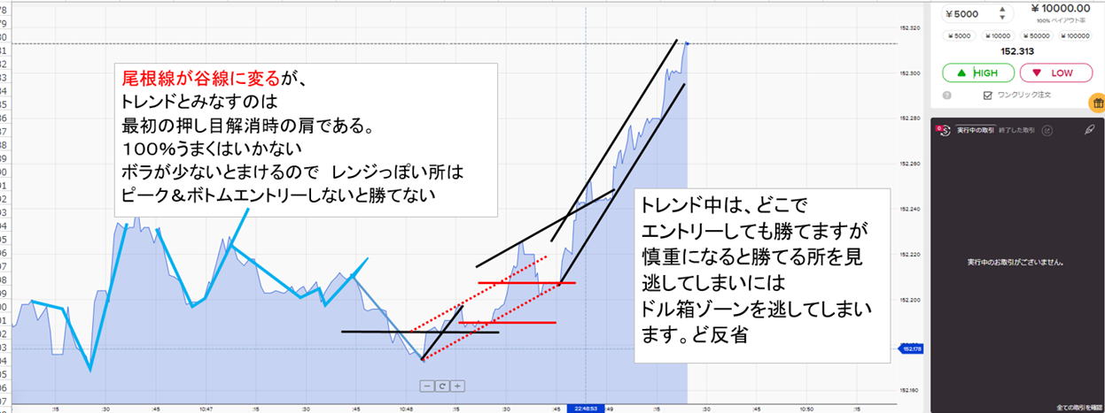 インディージョーン作戦&ライントレード トレンドを制覇しよう。少なくても2分あれば勝てます。順行から反発したところを逆張りします。 なだらかな順張りチャートでは、順張りでエントリーしてください。ここでも大きくはないが少し凹んだり凸ったりした瞬間にエントリーする練習を兼ねてください。 手法 ①5分ラインチャートでトレンドか崩れたところを探します。 綺麗ななだらかな完璧なゆっくりとした坂道はないでしょう。多少凸凹でもOK 崩れる所は、基本は水平線ブレイクですが、一般チャートやRSIで探してもいいです。 目安はお椀の形です。お椀のヘリあたりです。一般ロウソクチャートだとレンジブレイクです。 簡単に言えば肩が下がっているか上がっているところです。 チャートなら同じ色のロウソク軍団 ここでは一般チャートを出していますが、慣れれはハイローの5分で十分です。パターンも見て時間幅の検討も付けます。 終わった図ですが参考にしてください。 ![]() ![]() 長いトレンドの方が良いに決まっていますが、その選び方は後で記述します。 ⓶15秒画面に移ります。 ライントレード ラインを意識してブレ戻りを狙います。 赤Lowエントリーここで坂道がなんとか形成されていれば、勝負します。15秒続いた坂道ラインチャートは、30後まで続くので 細かい利食い反発でピョコンとなったところで順行エントリーすれば、勝てます。 実際にはぴょこんと上がった瞬間にエントリークリックしないとエントリーできないので練習してください。 滑ることもただあります。 最後は、ぴょこんと上がってそのまま反発すれば負けますので、しばらくお休みします。 ![]() ③エントリー 理屈は下記の通りです。ぴょこんと上がった下がったとしても短くも長くもトレンドは続くので もとに戻る癖がありますのでそこをそれに追随するんではなく、逆に順行すると見てエントリーします。 教科書的なイメージ =>実際は![]() 最後が負けるくらいじゃないとダメです この手法は慎重になればなるほど負けます。 理由 負けパターン 図11.12 ビビッてるとエントリーしない トレンドが終わっちまうぞと思いきや、ようやく、最後にここぞとエントリー、これじゃあ負けに行くようなもんです。 慎重もくそもへったくりもないんです。 図ではポイントがかかれていますが、これては後からの分析で、教科書の世界です。こんなうまくいくわけもない(時々その通りに行きますが) 上手くなれば、最初にエントリー一回二回しておいて、45秒後には様子見します。 先行逃げ切りが必須です。 長いトレンドだろうが、短いトレンドだろうが、15秒画面ではせいぜい勝負できる時間枠は1-3分程度です。 長いトレンドだって上下しますので、勝ちパターンチャートが出現する場面が、出たり出なかったり、呑気にだらだらエントリーはできないもんです。 最後は、負けると分かっていてエントリーしていかないと先行型人間になれません。この訓練は人間の本性と逆行するので 修正するにはよっぽどの訓練が必要 図10 階段タイプ 深夜でボラがないと階段のステップ部分が長いのでと負けます図11.12 起伏の激しい上昇では遅れると負けることもあります。 お椀を意識して売りもエントリー瞬間ドカン&ピョコン・ボッコンのくさびノイズ 深いくさびは、反射神経的にエントリーできません。浅いくさびは、できないこともない。待っていればできます。でもいきなりは無理 ドカンのズッコンタイプ 90度で上下する時は一瞬なのですぐに戻る性質=>その後![]() 1番底を見逃して、たまたま2番底でエントリー 勝ったけど本当はダメ |