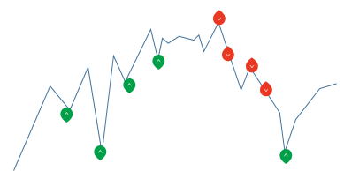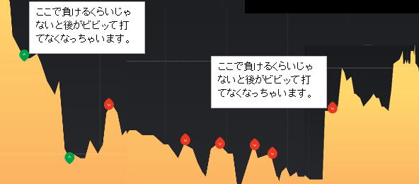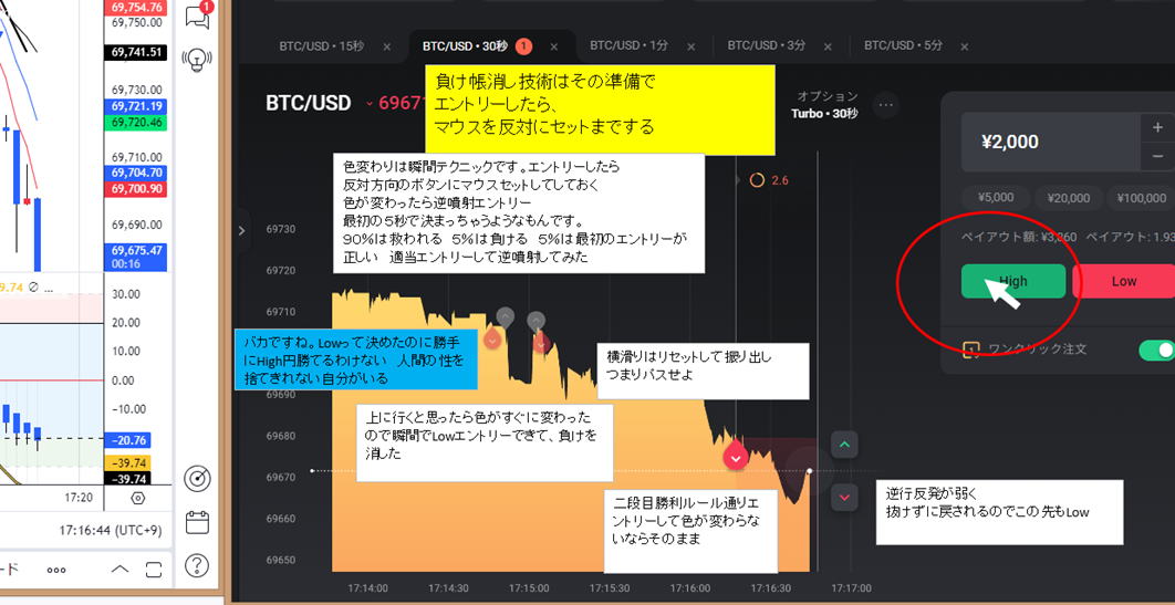 | 勇気 | 勇気を出してエントリー 負けても引き分け 下げ相場でもっと下がると思ってLowエントリーしたが、いきなり反転しまったら逆に打ちます。 (パターンを見れば上げ1下げ2なのでやばいんじゃねーとお叱り受けそうですが解説なのでお許しください。) 勝ち負けでも200円儲かります。変な感じです。 負けちゃっているので2発エントリーするかどうかは練習して決めてください。 悪意があればペイアウトは2.05なので同時にHighLow打てば差額が絶対に200円は儲かるはずですが、 こればかりやると、常識的に反則技と認定される可能性が高いので気を付てください。 以下の場合はLowエントリーの赤マークはグレーになりますが、見ずらいですので、分かり易いようにLowエントリーを赤く表示しました。 勇気じゃないですね。損しない技です。 あまり離れますと打止めた方が良いです。後打ちしたものも負けてしまう可能性があります。 エントリーして3秒以内と思ってください。 ![]() 下げ相場では、噴きあがったところでLowエントリー 上げ相場という根拠でやるのでフラットの所でやれば死にます。 ![]() |