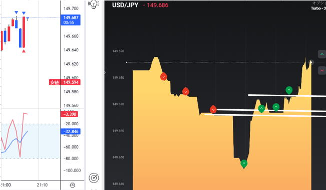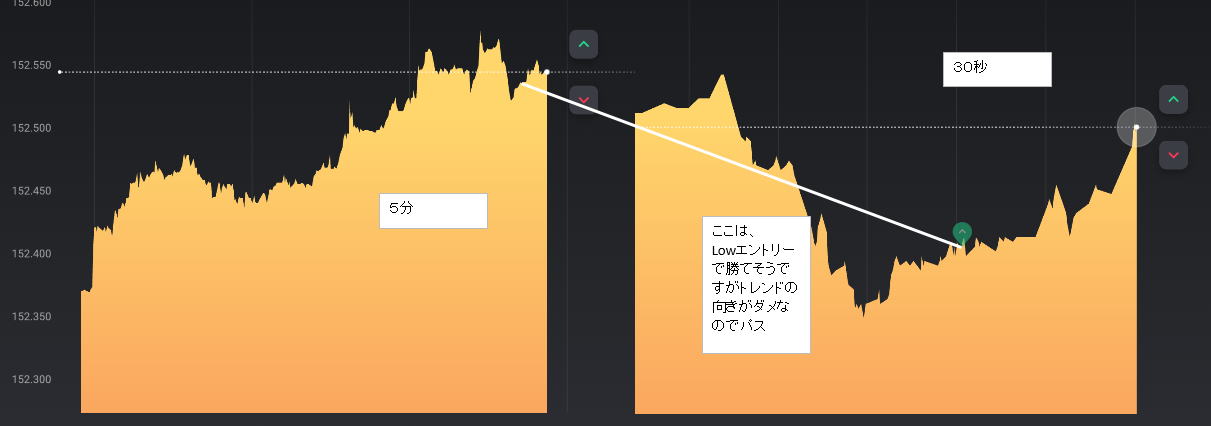 | エントリー時間使い分け | エントリー時間使い分け 15秒ではブレで負けたので3分に切り替え 大きな流れに乗った感じです。横滑りも長いので負けます。 無理に時間を変えず待つのも手段 |
