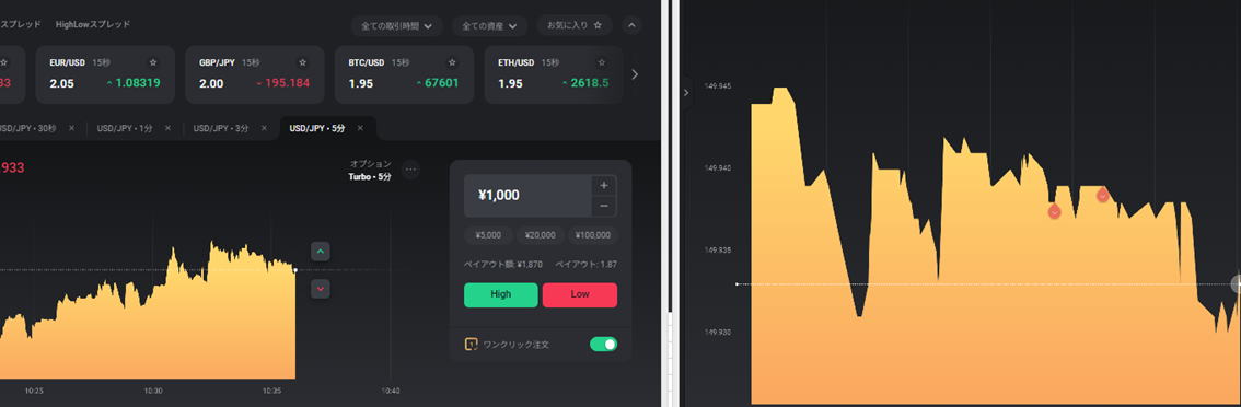 | 5秒チャートで勝てるか? | 5秒チャートを見てハイロー15秒は勝てるか? 結論:これを見て分析にするのは、素晴らしいがエントリーポイントはハイローで15秒エントリーするとタイムロスが発生して勝てません。 やるなら30秒以上です。 |