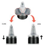 先端キャップが組み込みで外れません。よって先端キャップの紛失の心配がありません。 地味なデザインですが、消費者の事を考えるとベストです。 ノズルキャップを回すと、上にツイストアップして動きます。液体が出ます。逆に回すと締まります。 |