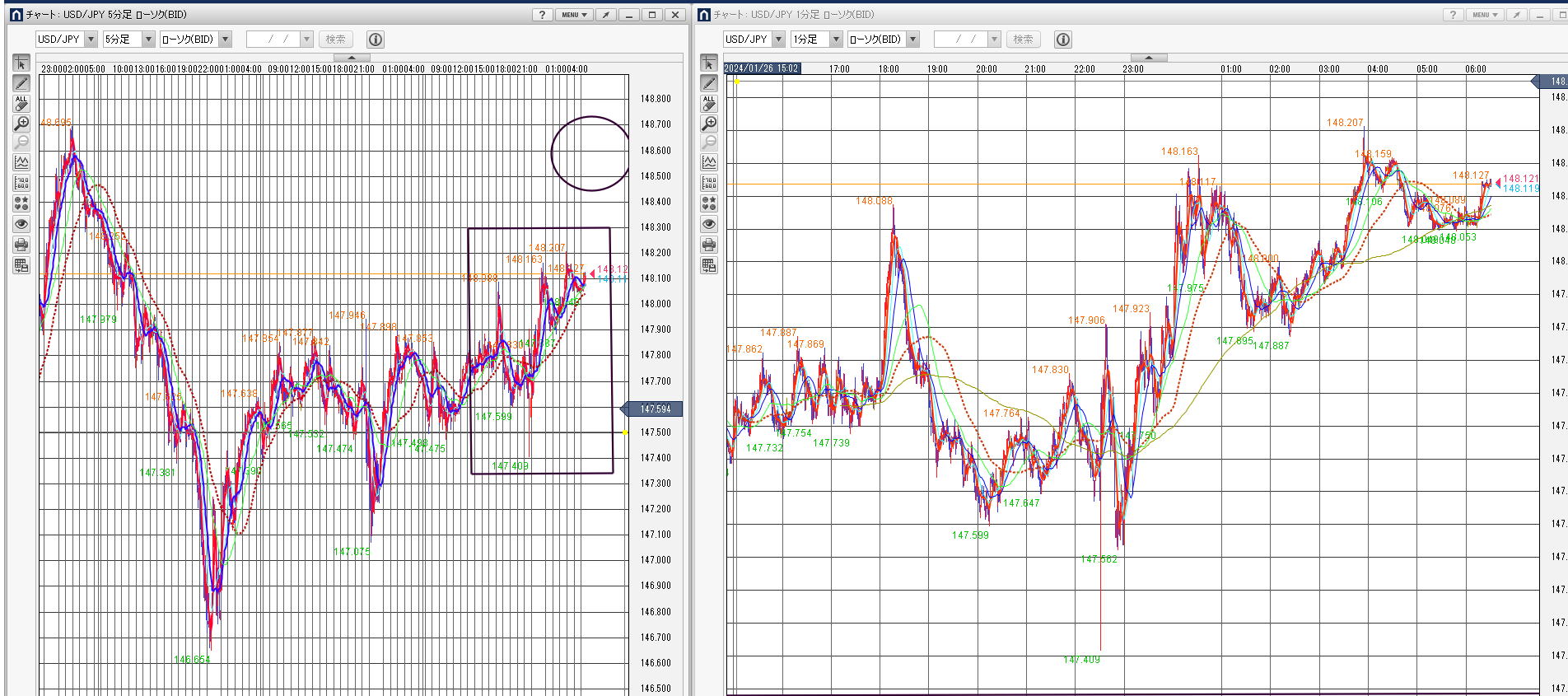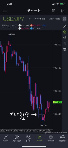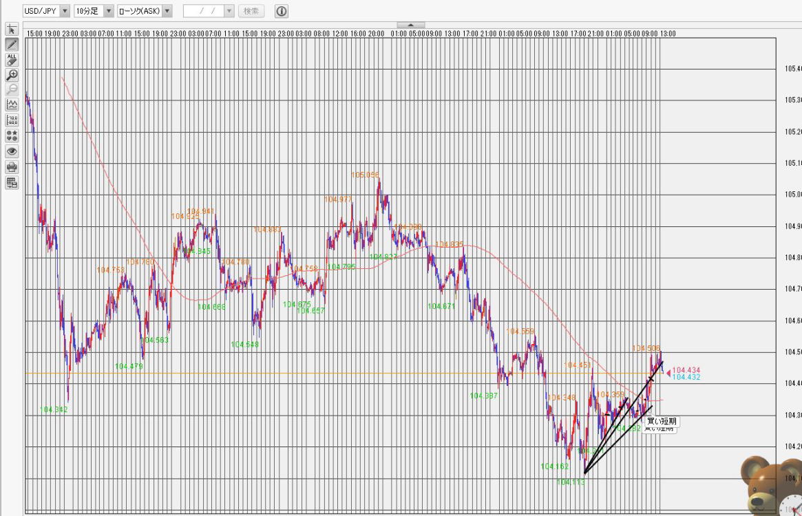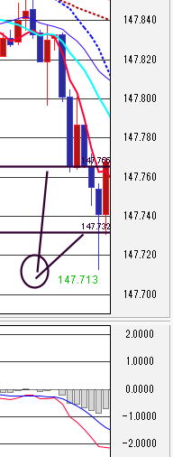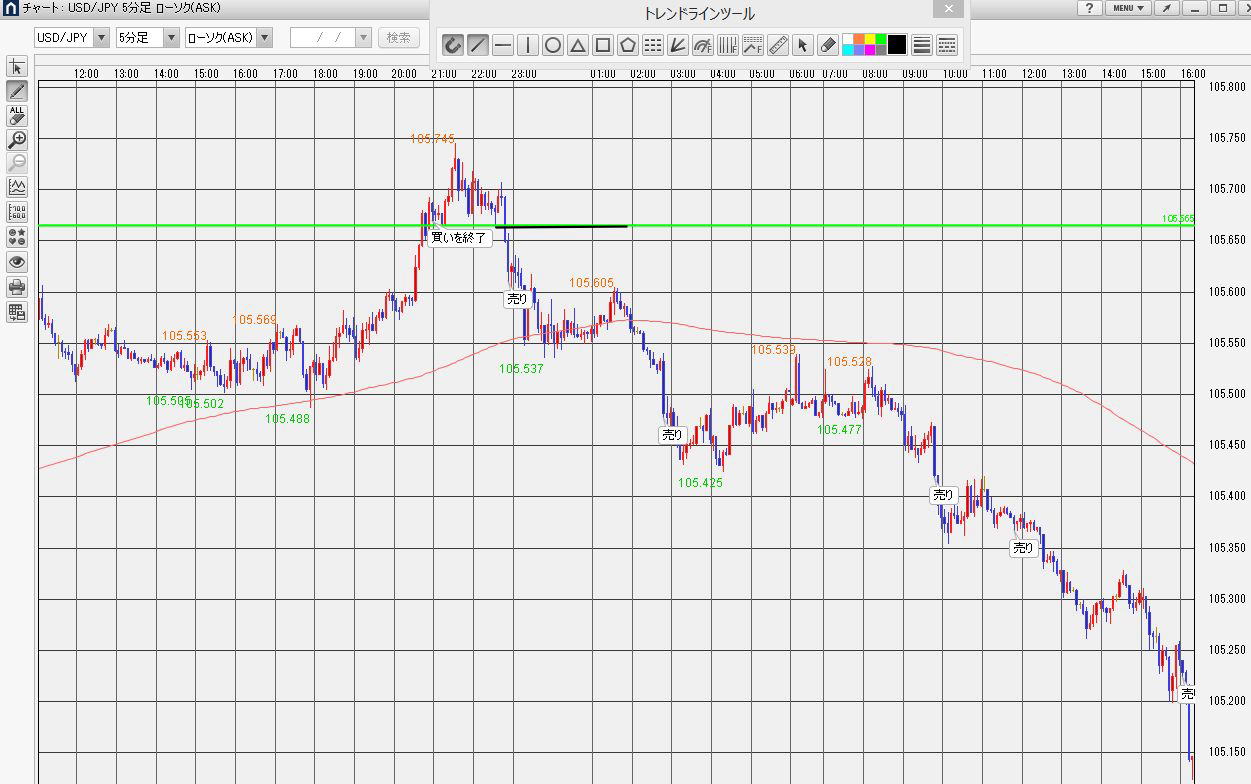再エントリーします。 丸の場所がポイントです。 ![]() 相場は続きますが今のところ、5分足を見ればまだ伸びしろがありそうな気もします。 |