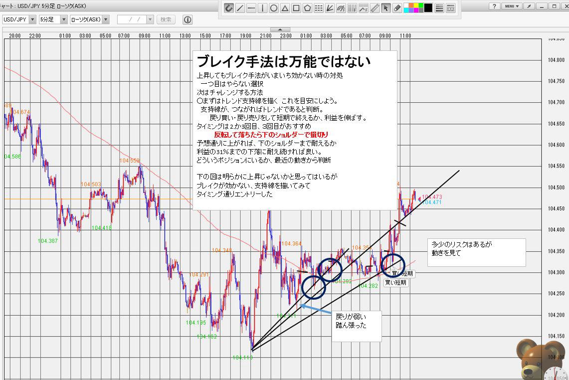 | このトレードは、逆張りになるまで待って、その後順張りで押していく手法です。 トレンドを川に見立て、流れが変わったらエントリーして流れが変わるまで続ける手法です。 川の流れの中でレンジができて、さらに、その先を行くブレイクの時に追撃しても良いと思います。 理由はそこで反対に動いて損しても、すでに利益が出ているからです。さらにブレイクの確率は高いので追撃するか 再エントリーします。 丸の場所がポイントです。 ![]() 相場は続きますが今のところ、5分足を見ればまだ伸びしろがありそうな気もします。 |