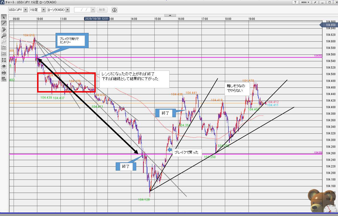 ![]() ブレイクの定義 ![]() 20201021の一人反省会 参考にしてください。バーチャルでうまく行かない人は、実弾でも絶対に勝てないです。 そんな甘くねーーーよ。 V字は、100%反発するが、U字にヒゲがはえていても意外と反発するんだなあ。 U字の太鼓キャンドルの上に生えれば落ちるし 下に生えれば上がる。 レンジの終わりには、広がる時と狭くなって収縮する時がある。 広がると上がるし、狭くなると落ちちゃったなあ。 これって使えるかなあ? 予測は、はっきり言うがぜんぜーーーーんわからねえ。 全体的なトレンドに頼るしかないか。分からずもどんどん線を引いていればそのうちうまくなるって言ってたなあ 携帯の縦画面なんかじゃ線が引けないじゃん。話にならねえ、うまく行きっこねえよ。 過去携帯では10戦9敗1勝 才能なくても50%だから 負けの天才で死ぬしかねえと思ったくらい。 当たらなくてもいい。他人に見せるわけじゃないので、必ず予測の線を最低一本を書く。どこかの先生が言ってたなあ。 それから、最低一本、できたら3本 グランビル法則で12345を意識しろってね 実際の所、1、2、3くらいしか書いていなかったけど十分だったよ。 実際にずれたら、自分がずれていて何がずれたか考えればいいだけだって、 本当だよね。 損切りも早かったし 勝癖がつけば死ぬまで儲かると思う妄想はいけない。調子こかない。と聞いてドキッとした。 YOU TUBEとかたくさん見て、分かるところはどんどん吸収しよう。ちょっと偉そうだけど 言ってしまった。 最後は自分の日々学習で自分のスタイルを確立してくださいね。 他人は他人で誰も助けてはくれませんよお。 やってはいけない相場は以下のような時です。 4時間続いたのですがずっと我慢してください。こんなところでやっても手数料取られるだけですから 儲かるわけないでしょう。スカルプのスカルプはダメですね。 わかっちゃいるが手を出してしまい、ここでは、損失が出ました。 後悔は先に立たず、欲かいて格好付けちゃあダメなんだねえ ![]() この後、売りトレンドになった。 儲かるチャンス お金が落ちてくるといっても過言じゃないと思うくらい このとおり、最後は、レンジボックスからブレイクで解放誰が見てもここでは売りです。 その後は以下の通り 今日だけは、調子こいて3回の追撃しました。 ![]() さらに いつ底になるんだというくらいこうなりました。昨日の徹夜から ここまできますといけるところまで来たという感じアランさんラインありがとう。止めるっていうのでつられてやめて寝ちゃったけど そこが底だった。起きてびっくら玉手箱だった。 なんという名前にしたらいいのか、ふにゃトレンドかなあ?言葉が悪いぞ、お前!って言われそう。じゃあ スロートレンド! |