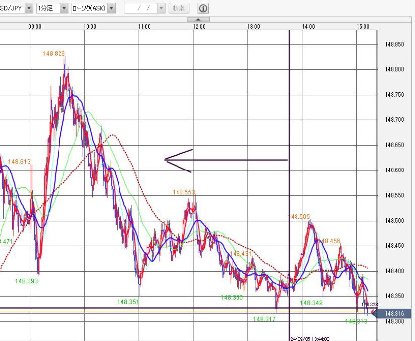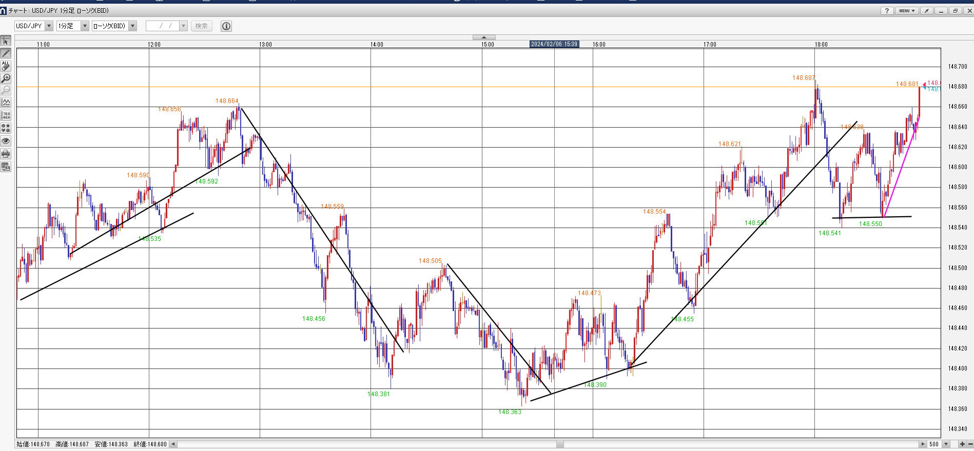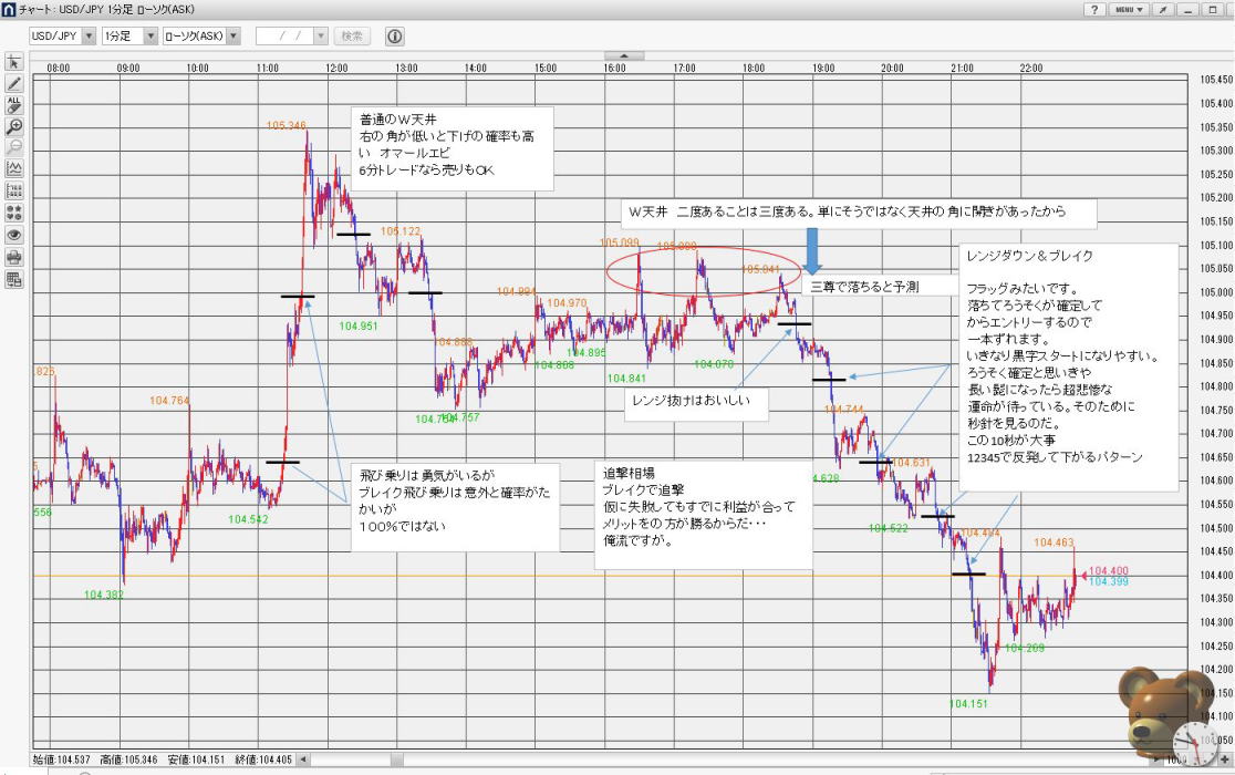拡大して支持線を引くと、なんだか見えてくるものがある。 支持線の引き方は、簡単、 下げなら、最高の高値とすぐ近くの高値の線を引く、 上げなら、最高の安値とすぐの安値の線を引く これだけ でも時間が進むと線を書き足していくのが良いです。 これで勢いが急になったとか緩くなったと感じます。 支持線がろうそくに当たればそこはトレンドの変わり目になるってわかるのでルールに採用 線は何回も引きすんだよ。前の線は消すな 当たったらすでになっちまっていると思わないとダメ 当たったから一旦やめた方がいいです。 下の図では、最初は、10;45に当たり終了してもいいですが でもそこはミニレンジだった。 ちょっと我慢したらレンジが続いた。我慢 11:00分で支持線増設 12:00でもレンジ中 12:00になるとレンジ幅が収縮して細かい波動あとちょっとかな 12:30前にミニブレイクがおこり、継続し、細かいリバウンドは我慢しながらも ずるする下降 14:10にさらに大きい下落・・・歓喜の雄たけび上げる ヨッシャー 14:20本業のお客様から電話入ってしまったので終了 しかし、ここで線を引きなおせば、さらに落ちるって分かったがあとの祭り 自分ルールなら14:43にも支持線を引くとろうそくに当たるのが14:50でここならパーフェクト 自分の最終の支持線では15:20に終了させるのが理想だった 自分ルールが守れなく、なんだか後味が悪かった。反省 その後 15:00以降はトレンドが反転しつつ、15:30に認識、ブレイクがあったからだ。 飛び乗る 16;11にヒゲが家に3本でた。案の定下げたので16:18に終了 その後はやらなかったが、マンターゲット出現 支持線に当たらなくて行くすぎちゃたらそれでいいの? 良い訳ねえだろ。 そこそこ離れてトレンドで行けばずううううと継続できんじゃん。 でも、離れすぎれば、そんだけ儲かってしまうが支持線に戻っちまうじゃねえか。 だけど戻れば、支持線で反発して、トレンドが継続するんだなあ この支持線ってすげえじゃんか、 最後は必ず当たって反転するのも事実 どこかの先生がネットで言ってたなあ。 二度あることは三度あるって 三回目のタッチは、信用できんじゃん。今日は良い勉強になった。 平均線なんかくそだぜえとどこかのユーチューブで見た ちゃんと出せよと言いたい。基本だぜ みんな見てるよ 後出しじゃんけんんみたいでずるいじゃん 5MAにすれば100%だ。 そんな細かく注文だせないし、 平均線を増やすと、ずれて遅れるしね でも検証してずれるから良い 半分以上は、当たる。でも40%は、とんちんかん。勉強不足かな。 確かに平行線でダウ戦略でトレードすれば堅い どこかの先生がネットで言ってたなあ。 二度あることは三度あるって 三回目のタッチは、信用できんじゃん。ローソクを見るんだよ。ほかは見ちゃいけない。 今日は良い勉強になった。 しかし平均線の向きは非常に大事だと思っています。 ![]() 波動が短いとブレイクでうまくいくがそんなに儲からない、でもぼーーーと見ていたら、利確しようと思ってるうちにドカンと落ちで元に戻っちまう。 波が荒いとうまくいいかない。トレンドラインは引くもんだ。基本だからね。 |