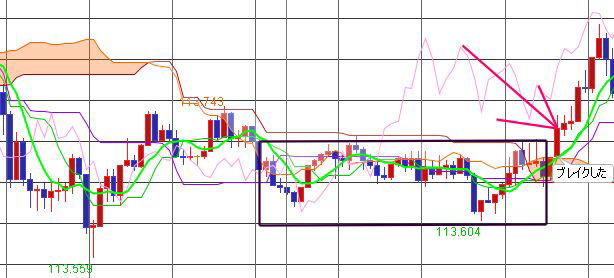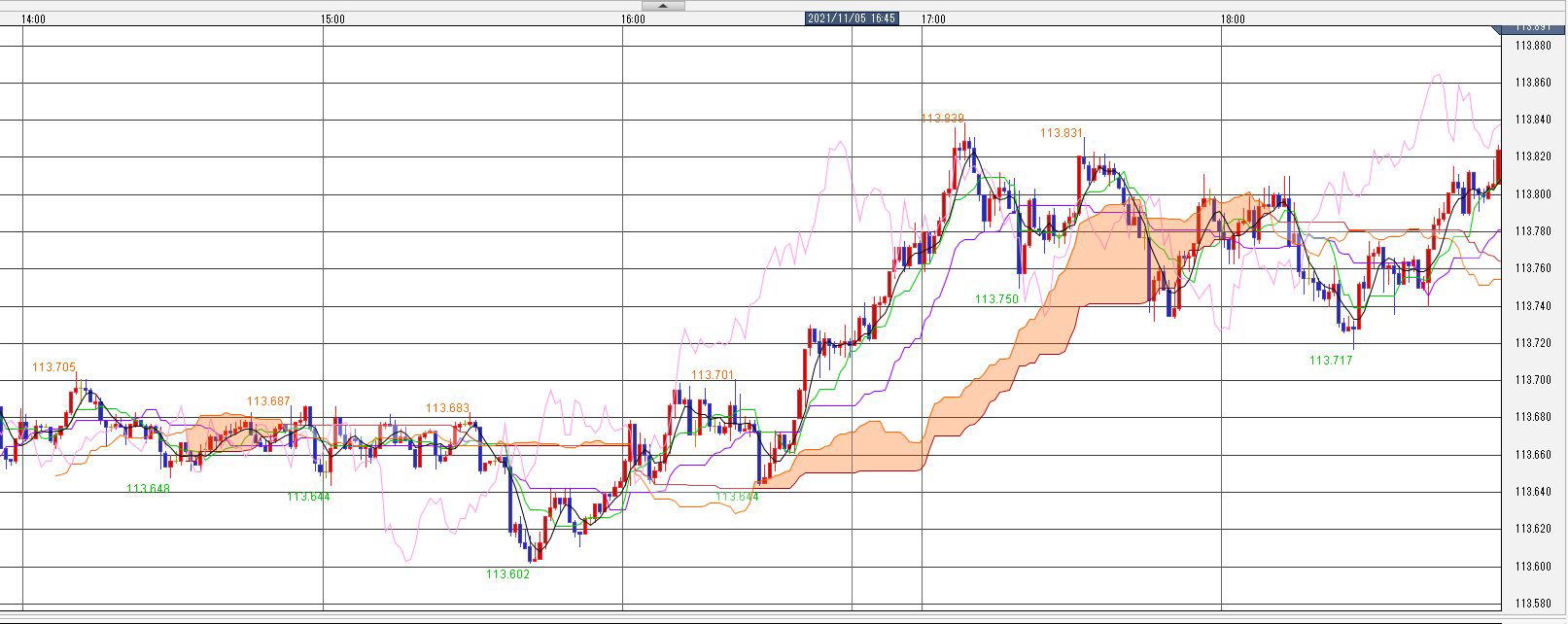 | 時間感覚を大事にしましょう。 一目均衡表は、平均足のようにその場の勢いを表すものじゃなく、時間の流れを感じるためのもので あります。 雲に入る時間や雲から出る時は大きく値動きします。雲の上でも下でも、上昇下降の動きがあります。 雲の中にろうそくが連なるとレンジとなり、拮抗しますが、レンジ開けのブレイクではそこから新しいトレンドが生まれる場合が多く エントリーのチャンスです。 チャートをみると、30分や一時間毎でトレンドが逆転するときが多いです。やっぱり人間がやっているからかなあ 鳩時計のアプリを携帯に入れて作動させています。 朝の5:00にシドニーがオープンします。特に朝の9時は東京市場が開くので大きく値が動いてトレンドが発生します。 18:00にはロンドン、21:00には、ニューヨークがオープンします。夏 季節によって変わるので時々チェックしてください。 20211105 5分足 20211105 1分足↓一分足![]() 一目均衡表で大事なのは雲です。 太い時もあれば細い時もあります。レンジでは細すぎて雲がつぶれますのでダメです。 雲から抜けた時がチャンスです。 また雲ばっかり見ていないで水平線やトレンド線も引いて流れの方向や勢いを見てください。ブレイクの場所がはっきりします その場所は雲が無いのでやっぱりチャンスなのかな 雲からか離れちゃって戻ってくる時もチャンスです。 |