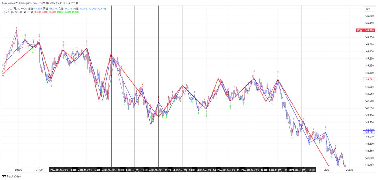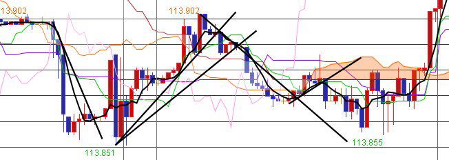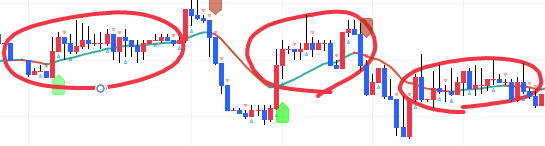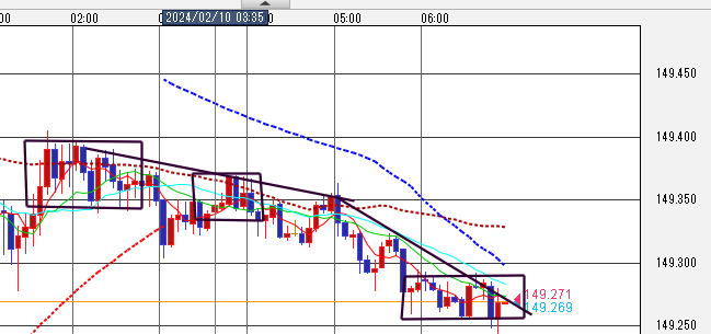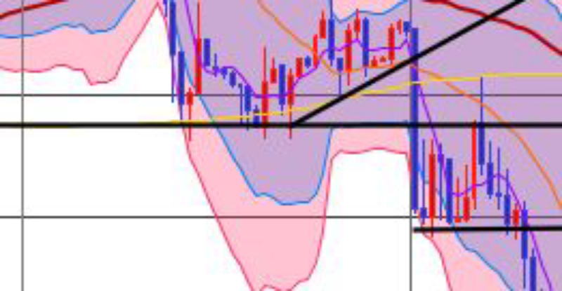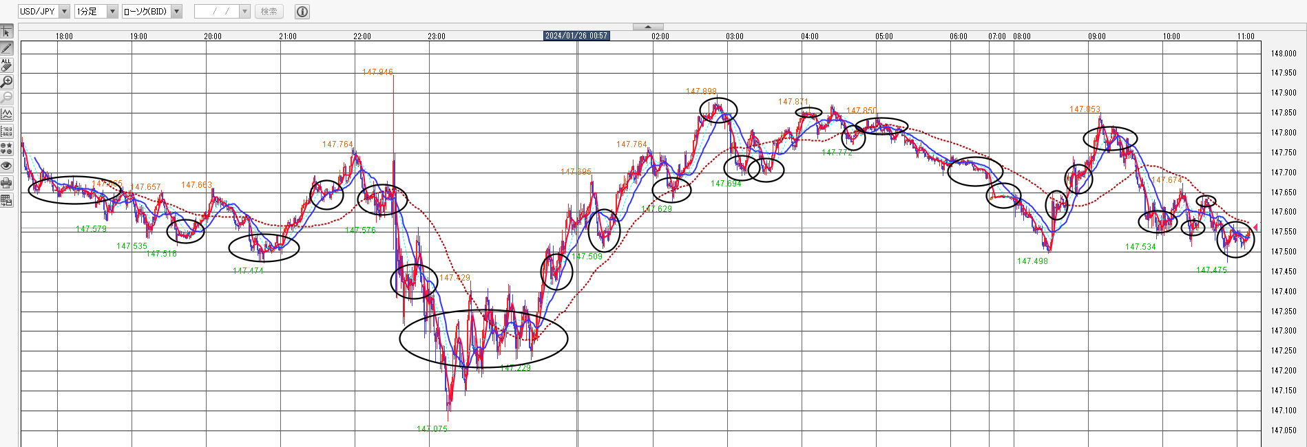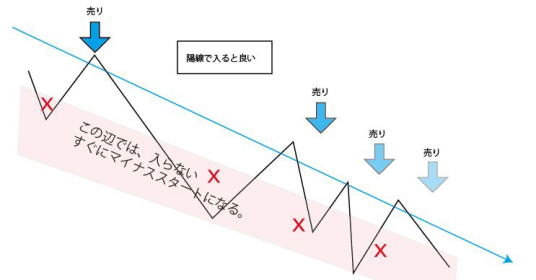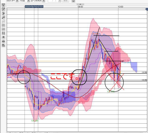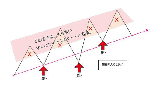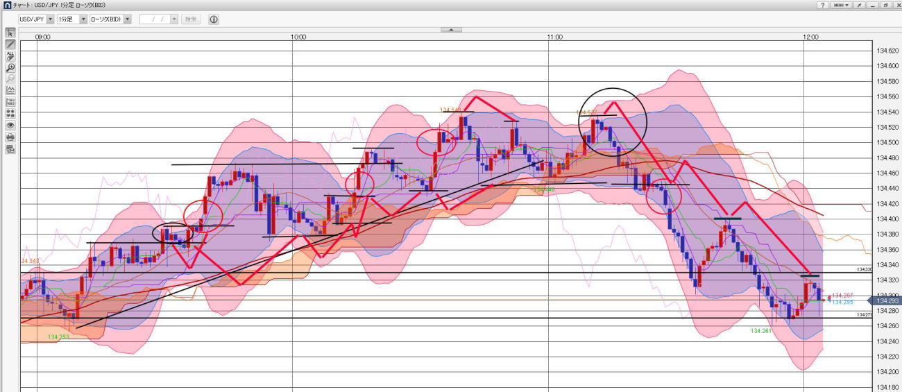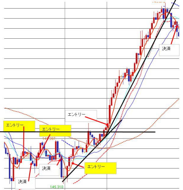 エントリー 条件①ポジション レンジの中は使えません。レンジになれば中止か我慢するかブレイクを狙ってください。 反転からレンジに移行する場合も同じ、初心者は終わりにします。 ![]() 勝っても負けても知れています。いつの間にかレンジになっています。まめに線を引きましょう。 条件②トレンドラインがプラズマクロスを確認 (プラズマとはプラスマイナスの電子が混じって中和している状況にたとえています。いつかは分離放電します。 FXの場合はトレンドラインとろうそくが、クロスすることをここでは指します。) 条件③平均線の通過位置と向きで確実性がより高くなる。 買いの場合 5か7本の平均線が陽線の半分より下で通り、向きが上昇角度なら買いでエントリー ![]() 売りの場合 5か7本の平均線が陰線の半分より上で通り、向きが下向きなら売りでエントリー 赤が○です 上の赤線は○を描かれいませんが○です。前回のトレンドの始まりの水準が望ましいですが、そんな都合よくはありません。 3分くらいたたないとわかない時もあり、ちょっとむかつきますが、その間は我慢してください。 半分はすんなり順当に進むでしょう。 デメリット デメリットもあります。 平均線の向きが定まるのが遅くて気づいたら次の足になっている場合もあります。 さらに、急角度の場合は平均線がどうしても遅れます。・・・そういう場合は、トレンドラインとろうそくのクロスで入ってください。 レンジかそれに近い相場になると反転を繰り返すので無理があります。 厳密に線を引きますと多少の反発で川の流れが変わる場合があります。 トレンドの時間軸を把握するのが難しい ![]() 厳密に引くと、トレンドラインはずれる場合があります。ずれても一回までにしています。下図 ![]() ここはルールなので考えないで入る。 考えていたらチャンスは消えます。シャドウトレーニングで練習します。 直前からよく見ていてポイントになれば声を出してもいいです。。せいぜい15秒といったところ 複数の人と一緒にやると自分のタイミングがずれていることに気づかされます。 結果の責任は個人ですが、少額なら複数人数でやってみても良いでしょう。 豚のしっぽのところが、エントリーポイントとしています。13打数12安打です。一回ダメな時がありましたが 向きが下に向いたので即損切りすれば大けがになりません。 下の図では 最初の赤丸は向きがダメなのでエントリーしません。二番目の赤丸もろうそくの上を線が横切っていますのでエントリーしません。 水色は、途中エントリーの売りタイミングと言えます。 その足で入れる場合もあるし、滑って次の足になる場合があります。 この後もよく向きを観察して損切りラインを超えたら中止します 最初の青丸のところでは、ルール通り買いましたが2分後には向きが下向きで損切りでうまく行かなかった。 二回目や三回目は、すんなりうまく行きました。十分にプラスです。 ここは新しい流れの始まり。新しいトレンドが始まる。 しかし、トレンドは毎回発生するとは限らない。レンジになる場合もある。 多少の変動で折り返し価格までのリバウンドまでは我慢したえる。 なかなかそうはなりませんが、FXは常に上昇下降を繰り返している。 そこを超えたら負けと判定し終了させる。 流れに乗れば5分足で見てもっと大局で行っても良い。 トレンド線を引きながら、全体の形や流れをつかんで局面を見極めてください。 より確実なポイントは二番目か三番目の赤丸の売りということになります。 ![]() 十分なシュミレーション訓練を行い、考えずも訓練通りのリズムでエントリーするまで待つ忍耐と素早く入る訓練をしておくのが大事 もたもたちんたらしていたらやらない方が良いです。ここはものすごい自分の訓練で3か月も毎日やれば身につきます。 リアルなエントリーポイント もたもたしていると先にいかれてしまう。![]() 川理論 ずばり相場は川なり FXや株などの相場は売買の連続であり、売ったり買ったり値に幅がでます。 仮にも100円であったものは一分後100万円にはなりません。 101円になったり、98円になる場合 3円幅 90円になったり110円 20円幅 になったりします。 狭い時も広い時も様々な幅が、あるもんだと誰でもわかります。 よって この幅の中でで推移していきます。この流れをリバー・川といいます。 チャートを見たら川だと思えばいいでしょう。 それを表したのがトレンドライン 下の図では。川というくらいなので、両端が描かれていますが、 両岸を線で引けば、いいじゃんとなりますが、とても見にくいです。実際は上昇なら下値をつないで 下降なら上値をつなげばいいです。刻々と変動していきますので引き直しは、ざらです。 スッキリしますよね。これがトレンドラインと私は言っています。 およその幅が分かればいいので出発はひげ先でもろうそくの実態でもいいのです。 ![]() ↓ 値が動くとトレンド線はろうそくに絶対に必ず当たり