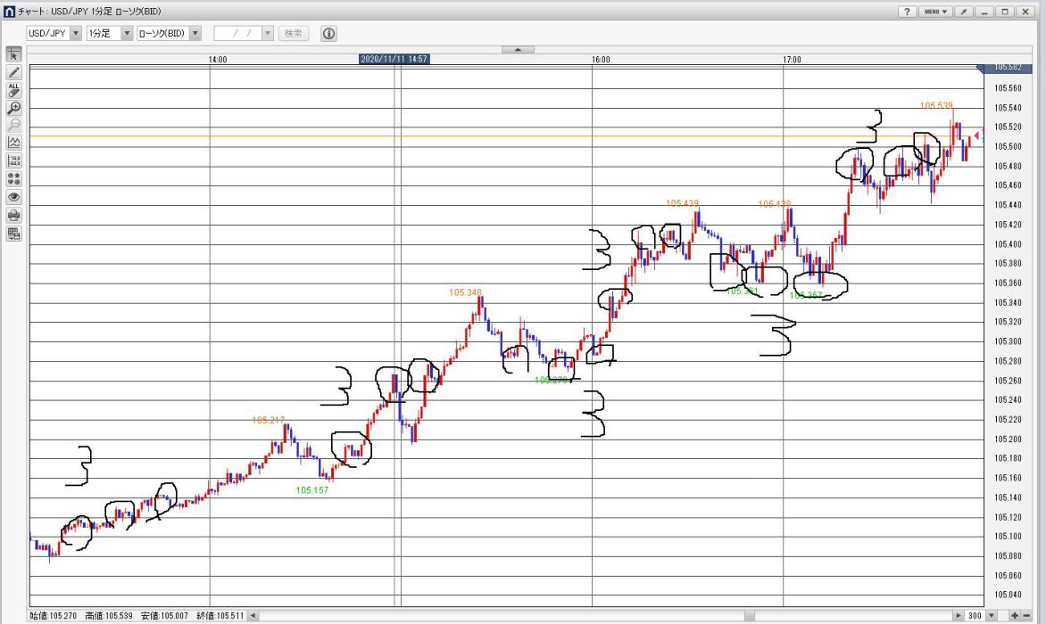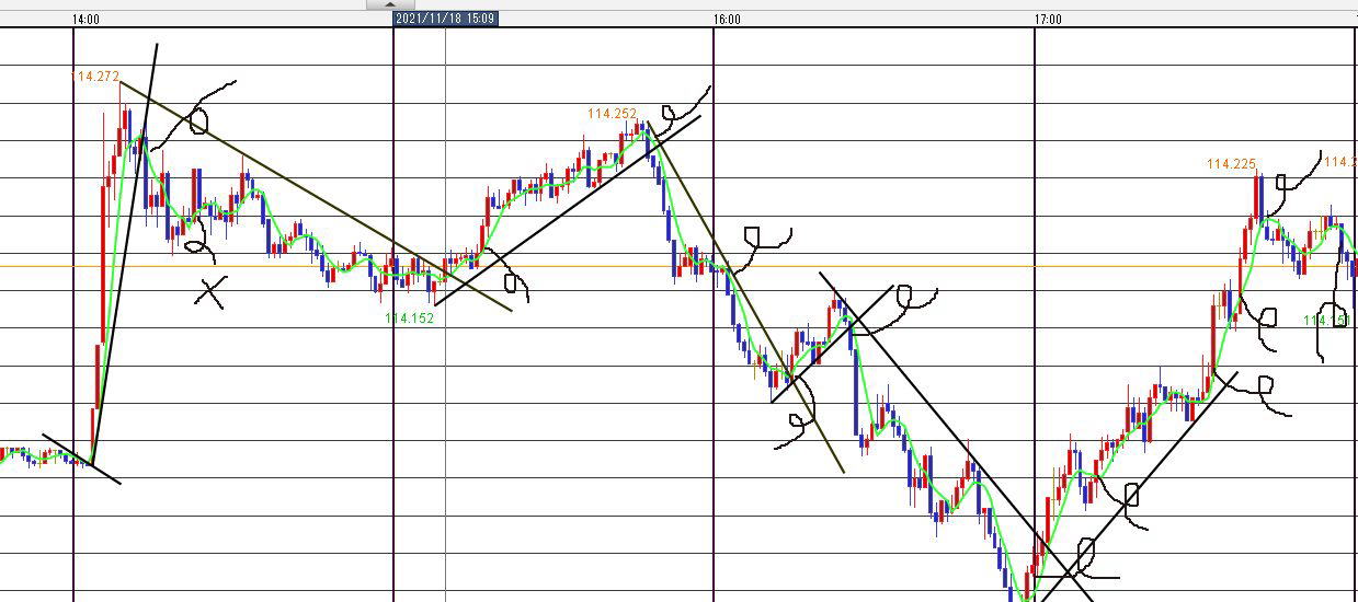 予想して決めつけてエントリーするっていうのは、寄付行為です。止めてください。 そこで、本命や次の本命の2パターンのシナリオを描くって大事です。 思う通り、川の中で上がったら追撃する、下がったら追撃していかないと利益が取れません。 これはだいぶ慣れてからやることなのですが 慣れてくると全体の雰囲気が分かってきますが、どんな雰囲気って言われても困ります 予測通りに進むとその日は全勝という時もあるし、一発目でだましくらって気がめいることもあります。 ある外国のユーチューブで以下のコメントをしていました。 トレンド 下げなら下げだけでねらえと言っています。 勢い 角度があるかないか 山や谷が大きいか小さいか 一本が長いか MOMENTUMといいます。 パターン 長いトレンドもパターンがあります。あまり一直線はないものです。 ろうそく 形とろうそくの組み合わせやどこでそれが出るかですね。一本の長さとひげも大事です JAPANESECANDLE STICK と言っていました。確かな分析だと思います。 この他にも、私は 時間軸 私はこれもあると感じました。9:00 17;00 21:00 22:00 AM1:00は激しいです。 私は一目均衡表(後で勉強してください。)で雰囲気と気分転換を楽しんでいます。 これらの背景から戦術を決めないとすぐにはエントリーしそびれるばかりです。 気構えも自信がないとダメなんです。 20211112の金曜日に、初心者とトレードしましたが、線を引くのが遅いし正確ではありませんでした。 勉強不足と言えば初心者なので当然です。しかし実弾を入れたので、後ろであおっていました。 エントリーすべきところを逃して何やってんだといわれて慌ててエントリーしました。 それでもプラスしました。半つぶれレンジのような場面でした。と思いきやよく見るとノートパソコンに2画面用意していて、 上のチャートがブッつぶれていてダメでした。画面を修正してよく見たらちゃんとしたトレンドでした。20PIPS/100ゲット |