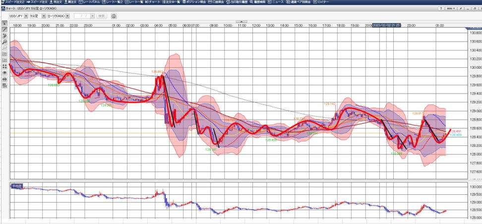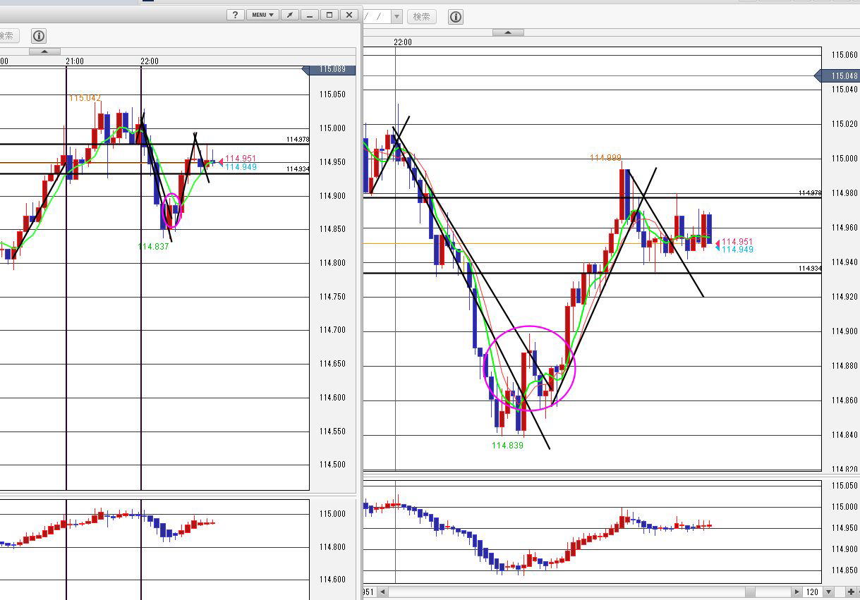 これでFXの勝負は決まるといっても過言ではない。 準備 エントリー前の準備 パソコン チャートはマルチフレームにして設定は保存してください。 以下のマルチ画面など参考にしてください。 線引き チャートにどんどん線を引く 平行線 トレンド線 平均線・私はパラボリックバンドも設定しています。 ボリンジャーバンドなど好みで描写 時間 最初は時間です。 午前中か夕方か夜22:00以降が最適です。 値が動かないと負けはしませんが勝つことさえできません。 トレンドの向きと角度 勢い トレンドの角度とろうそくの長さの比較をします。ろうそくが長いと勢いがあると言えるでしょう。 平均線の上か下か、解放方向か収縮戻り方向かを判断します。 そうすると上昇は買いのみ、下降は売りのみでやってみるとより安全です。 方向性 チャートの全体的な方向や長期MAラインの向きを確認します。 どの時間足のチャートでトレードを行うかによっても勝率が変わりますが。 どんな画面でも同じ方向を向いていれば勝率が格段にアップします。 しかし、そのような場面は少ないので、どのチャート画面を開くかは個人の裁量になります。 上記のマルチ画面で確認することをお薦めします。1分と5分とか1分と15分30分などのペア マルチ画面がめんどくさい時は、さらに長期の200や300のMAラインを描写しておくのも良いです。 マルチ画面:時間足の優位に従う 最低2画面用意します。1分と5分と30分と60分にチャートを見ます。 60分足でみますと一日のうちでトレンドの転換は1から2回くらいしかないです。 また60足で完全にトレンド転換しますと少なくても5時間から10時間は続きます。 5本から10本です。 5分足ではトレンドトレンド転換していてか売りを買いに戻すところです。 しかし60分足では駒足なのでキープかもしれません。おまけにトレンドキープです。 5分チャート 60分チャート 60分=>1分足![]() 小さいブレを大きな足では吸収します。 だから上位足で方向性をつかみます。丸から上昇ですが長くは持たないとわかりあmす。 1分や5分足で迷いましたら60分足で見て、今どんな位置にあるのか大体一発でわかります。(わからない時もあるが) 小さな揺れをばたばた気にせずにゆっくり見ることができます。ろうそくの本数が減って勢いもわかりやすくなります。 また時間を大きく表示しますので前回トレンドの底値や高値が表示され、わかりやすくなります。 細かくトレードして勝を重ねていく方法もあります。細かいと上下の変動をトレースします。 トレンド転換付近ではノーエントリーであるし、転換までのロスがあります。 60分足で見れば、前回のトレンド安値で水平線を引くとそろそろ底が来る予感がします。ボリンジャーバンドを見ても先行収縮が起きています。ここでは終点前のただの横ずれ程度なことでした。これも予兆です。モメンタムが弱いと判断できます。 下位のチャートと上位のチャートでは平均線の位置もずれます。 ここでもチャートずれがありましたがよく観察して自分なりに覚えてください。 長い足の方が優位です。5分で上がっていても60分ではどれほど上がっていなかったり、横ずれや下がっていればこのトレードは長くないと思ったらいいです。 矛盾したら、下位足でのトレードは、もう長くないと思ったらいいです。 |