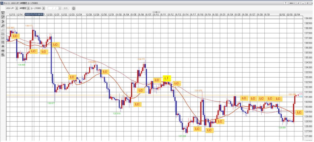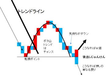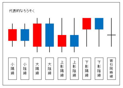 ここでは、大きい足の方が、細かいデータを吸収して単純化しますので、流れをより滑らかに見れることがわかればOKです。 また、ローソクのデータは、こちらの都合による時間ででデータを切っていますので細かい一分足では 証券会社によって時間の区切りが違うのでずれもありますので、正確に把握するというより、方向と勢いを感じればいいでしょう。 代表的なろうそく ![]() ![]() 使用される名前は代表的な名前であり他にも呼び方が存在します。 各解説は、以下の記事を参考にしてください。複合してどこにどう出るのかは、慣れてきますとある程度パターン化していることに気づきます。 ユーチューブや各証券会社にも解説がたくさんあります。ここで詳細を述べると先に行かないので大まかな記事のみにします。 株の世界では、ロウソクの組み合わせで、赤三兵 黒三兵、首つり、明けの明星 十字線 坊主、孕み、抱きなどの呼び方があります。 私は上ひげが長いものを、死神と呼ぶようになりました。空白の所です。皆さんも教科書とは違う名前を自分で作ってみてください。 パターンで形を目に焼き付ける ロウソク一個で流れが変わることもありますが、それはピークの時が多いですが、相場がピークだらけということはありません。 何本化の束の形で、流れがわかる』場合があります。 金・石油・穀物・株・FX等あらゆる相場に共通します。 相場は全部チャートで見ますのでろうそく方式でもライン方式でも形を覚え 後で自分で理屈が分かってきますと負けなくなります。やっていけば覚えることです。 私自身は、ろうそく・平行線・トレンド線だけでも十分だと思います。 さらに、テクニカル指標の数値も参考にしますと、勝率が上がります。 人間のやり方をコンピューターででプログラムするというのはできなくはありませんが、いくつもの条件の式を複合させます。 各プログラムによって定義が違いますが、and or で式をつなげます。 プログラムされた取引やある指標描写をインジケーターと言います。ポンプリンジャーバンド・RSI70・30、MACD反転、平均足反転、レンジブレイクなど) その中で確固たるポイントを信号といい、ゴールデンクロスやデッドクロスが有名で、ロウソクと平均線がクロスしたり抜いたりするのも人によっては、信号です 人によって信号はまちまちです。 ある手法を多ければ多いほどその方向に動きます。 トレンドラインのカウンターブレイクは、プログラム化するのが難しいです。 大きく結ぶか細かく結ぶかは人によって違い、決定的な式がなかなか組めないです。上級者になっても、トレードとプログラムを書くのは別物です。 自分で式ができれば、専門の会社に依頼してみましょう。MT4かMT5でやるので証券会社も限られます。初心者がそこまで行くのに2-4年かかると思います。 しばらくは自力で頑張りましょう。安易にユーチューブで転がっているソフトには注意です。そんなに儲かるなら自分でやったら良いはずです。いかにも儲かる広告には感心します。 いくらパターンであっても、価格の流れをなぞっていけばなるほどということです。死神(上ひげ)連発なら、上は行かないかもって分かります。100%じゃありませんが 00分近辺で反転することがたびたびありますの。右下の図でも2回そんな感じです。出現する場所にもよるのでそこの位置ででるか把握してください。 |