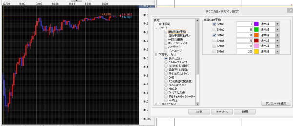 | 2、移動平均線 | 短期中期長期の線で描かれます。最初はデフォルト設定で使用して慣れてきたら自分で 最初はデフォルト数値 ゴールデングロスやデッドクロス 2本または3本の線が平行でトレンドを形成しているときもあります。 平均線で一番大事なことは方向性です。 平均線を見なくても割ると言えばわかるんですが。私はエントリー目標で信号とから1秒以内に決めていますが その目安にもなっています。 |
