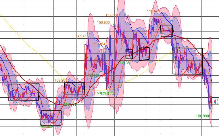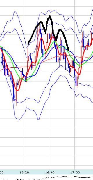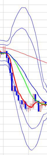 | ボリンジャーバンド収束 | 有っていたりいなかったりで、役に立たないが一応書いておきます。 相場の振れ幅(ボラティリティ:ボラと一般に俗語風に言っている)を一定期間の価格データから測定し、 価格の変動範囲を予測してチャート上に表示するテクニカル指標です。 標準偏差の線を上3本・平均線・下3本で描かれています。閉じたり開いたりします。作者ボリンジャーさんの名です。 相場が、上下の変動が少なくなるレンジ相場においては、バンド幅が狭まり、、価格変動の大きな相場ではバンドが開いていきます。 振り幅が狭くなるとエネルギーが蓄えられ相場の転換のシグナルとなり、ボラが大きいと広がります。 2Θラインにキャンドルが触れると逆張りする指標としたりします。 でもよくチャートを見ると天井や底付近になりますと駒のようなロウソクとなることが多いので見れば分かるので 最近は私は、時々しか使っていません。 この表を見るとなんだか、やっているという実感や自分がうまくなった気がしますが、まったく間違っていました。 たくさんの指標を使えば良いってもんじゃないと実感しました。 |