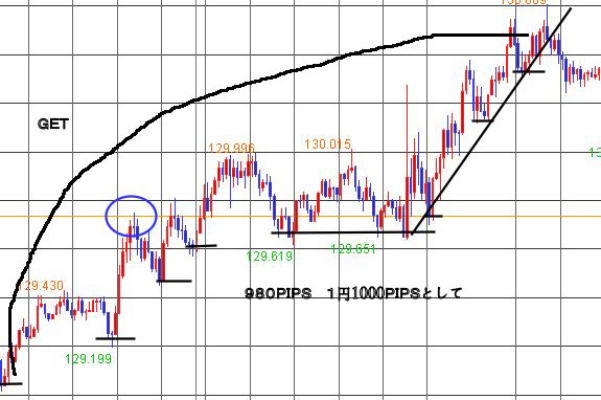 | 2.エントリーと手じまい | 大底や天井でエントリーすると最大の利益が期待できます。相場の動きは、連続性があり、画面を開いてすぐにやるのではなく やっても良い場面かどうかを判断してください。 またはトレンドが発生もしくは発生中の時の様に流れに沿ってエントリーしてください。 時間のタイミングも結構大事です。山や谷の形成は1分足で見れば小山が3~5本、大きな塊は30分か60分で形成されていますので 必ず待ってください。 手数料0円と言っておきながら、ただか、そんなことは絶対にありません。スプレッドという従量制の手数料が取られます。 0.2というのは、0.2銭0.002で1ドルについてです。 対象の通貨がど世界の通貨が様々ので通貨といいます。 10000ドルで計算すると、10000通貨(ドル)です。よって10000x0.02=20円 100LOTなら20000円 一日何回もやっている人も多いです。FXは増幅金額取引なので証券会社は儲かりますよね。 慣れてくれば頭と尻尾を取るようになれるでしょうから途中途中無駄打ちしないようにするといいでしょう。 押し目が天井と思って終了させないで、もう少し2分待ってみましょう。その後どんどん伸びるということもざらです。 トレンドラインを引いておくといいでしょう。 順張りの方でも、あとどのくらい幅があるのかで、追撃するか短期にするかどうかも良い判断となります。 手じまい:トレンドがいつまで続くなんて誰でもわかりません。いつ止めるかは、上記のことを参考にしていくつかの指標を参考にしてください。 |
