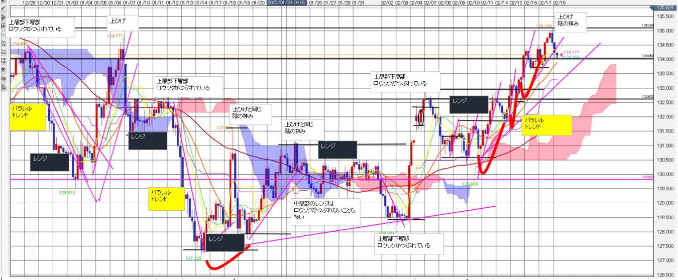 レンジが起こるときは、前もって決まっていません。決まっていたら苦労は、しません。 だからと言ってなんもしないのはダメです。 いつかは抜けるし、抜けたらトレンドが発生するので、水平線を引いて、ひたすら我慢します。 レンジ内の短いトレンドのロウソクの本数が6本なら、トレンドラインも引きます。 抜けたらエントリーしますが、失速してレンジに戻る場合もありますのでよく見ます。そのまま抜けていくこともあります。 大きなトレンドの中で、レンジが上層なら落ちるかな 中層なら下から来たら上 上から来たら下へ 低層なら上に行くことが多いです。 とらえ方には個人で判断します。これは自分でも検証してください。 |