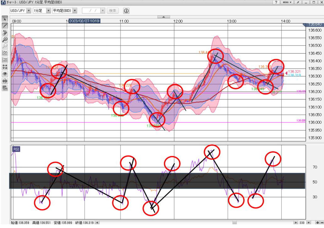 | 伝説の手法 | 伝説の手法 10万円を3か月で億にする方法 夢のような話 チャートは、平均足とRSIを表示させます。一般のチャート画面もマルチフレームで描写します。 私のソフトではRSI部分にトレンドラインを引けませんがそこは目視で行います。 トレーディングビューならちゃんと引けます。 決まってますが、レンジではやりません。 平均足の色が変わったらRSIを見ます。60以上(下の図は70)であり、RSIのトレンドラインもクロスしていては平均足の方向にエントリーします。 簡単です。 参考に:エントリー目安の指標では、人間の能力は限界があることを知っておいた方が良い。 後から出来上がったチャートで解説を聞くが、後の祭りです。前線の現場では指定等は自分ひとりです。 まあ、せいぜい2つまでくらいしか、機能監視することは、できません。 本当はボリンジャーバンドの3σも目安にしたいところですができないでしょう。 下の図は見やすいようにRSI40から60までは、黒い帯としています。 75MAと向きが同じなら3倍のLOTでエントリーします。75MAと逆なら利食いなどの戻りなので最低のロット数でエントリーします。 LOT数は、資金MAXでやらない方が良いです。せいぜい30%が限界です。ドカンが来ますとMAXで建てますと一瞬に証拠金率が0になります。 利益確定は、平均足の色が変った時にします。 ここでは説明だから1分チャートですが、価値が進んだら5分チャートでも見て流れの方向だけは、見失わないようにします。 ![]() |
