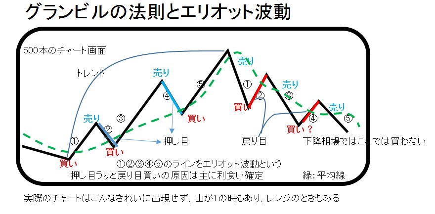 途中エントリー エントリーのタイミングは、ほんの15秒から長くて40秒ほどですが、うまく勢いに乗ればその後いつエントリーしても儲かるはずです。 最初はスプレッド手数料でマイナススタートなんですが、やっぱり、エントリーしてポンポン黒字にしたいもんです。 途中入場の場合は平均線の上なのか下なのかよく見て、セーフなことを確認します。 そして、トレンド線付近になった時や、平均線から一番遠い遠い反対のろうそくの時にエントリーします。 (下の図では、下降中なので順張りの逆の陽線でエントリーしています。ギャンブルのような感じがします。 ここでは、調子よく下がりましたが、トレントラインを大きく超えたら負けと判断します。 またトレンドにはグランビルの法則で12345の流れがあり、2の流れで入ることをお薦めします。 下記に記載した損切りルールも忘れないでください。 但しエントリーは、トレンド幅の中にある場合としてください。 赤のところですねトレンド線の上にあること、そして大事なのは平均線の向きがうえ向くと確率は高い 売りは矢印じゃなくてその右横の陰線 ここの平均線の向きが下向きだと確率は高い 右のようにきれいにはいかない 点線はトレンドライン グランビル法則とにかく平均線がろうそくの真ん中から上か下で判断してください。 |