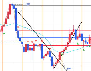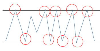 トレンドの種類 パターンは3つと教科書では言われています。上昇・下降・レンジ ![]() 時間帯によっても動きが出ますね。人が活動する時に値が動きます。 上昇レンジ 下降レンジ ![]() ![]() トレンドの種類 パターンは3つと教科書では言うが 実はそれ以外にも落とし穴があった レンジは横だけじゃない 斜めレンジだってあるんです。 教科書では、トレンドには3種あり、上昇トレンド、レンジ、下降トレンドがあるとよく書いてあります。 これは真に受けないでください。実際にはこれだけじゃ不十分です。 斜めのレンジもあります。ふり幅があると手を出しそうです。またトレンジに見えても、やっぱりレンジじゃないかというときもあります。 レンジの定義は、厳密にはよく決まっていないで、ある程度慣れたら個人の主観でいいと思います。 下の図はトレンドラインを引いていますが、ここに平行ラインを引けばレンジかどうかの区別が付きます。 ダウ理論が基本だと水平線ブレイクが基本になるが」、このようなギザギザ相場では水平線が機能しないです チャネルラインを引いてタッチでエントリーします。バイナリなら反発二本目で1分エントリーしてください。 |