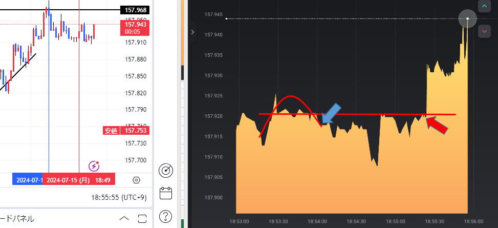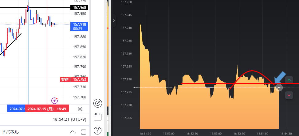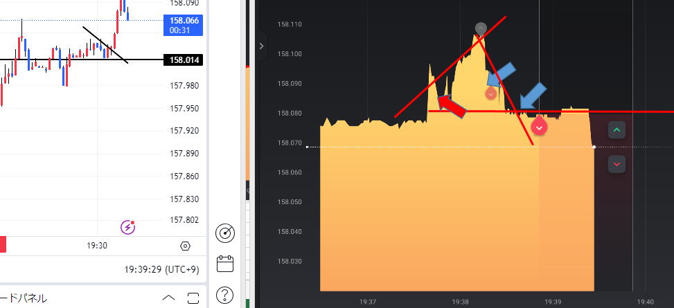 折れ線部分や階段部分でエントリー 深追いしない 二個目までにするといい反射神経が遅いと負けます。ゲームなどうまい人向けです。下がったらマウスはどっちかに決めておきます。イメージ ビットコイン15秒 マイルール通り 真ん中のエントリーはミス 遅すぎ アホです。 |