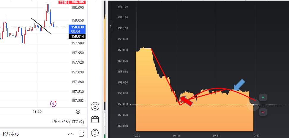 ラインチャートの基本の山は1分であり 中間の30秒で反転する事が多い。 00時間で多くは上か下かに決まる ○階段を作りながら斜面を形成する 階段を形成するのは出来高がなく空白を意味するので安定じゃないと言える 細かいギザギザで緩やかな尾根を作りながら形成 安定しているので20秒も経過すれば見えてくる。 30秒15秒エントリーを狙うのはここ ハイローのUSDJPは15秒は無い の二種類ある どっちがどうなのかは研究不足 |