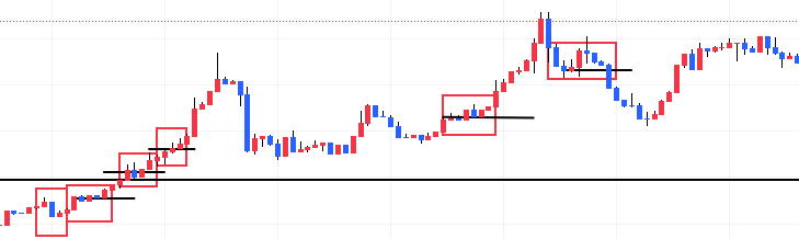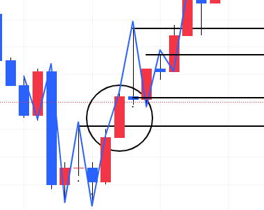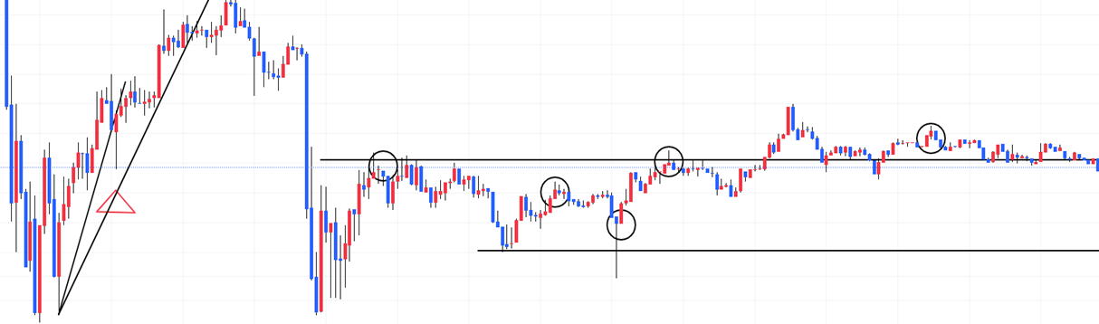 | 水平線 細かく二本のロウソクの位置でもダウセオリーにかなっています。抜けると本当に勢いがあるものです。 トレンド中最新のロウソクが、直前のロウソクを反対に、50%以上抜けたら、即エントリーします。 センスある水平線の引き方 反転時 鉄板N波のブレイクと上記の2原理が混ざっているような気もします ロウソクはこれ以上ない最新の値動き |