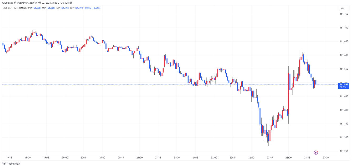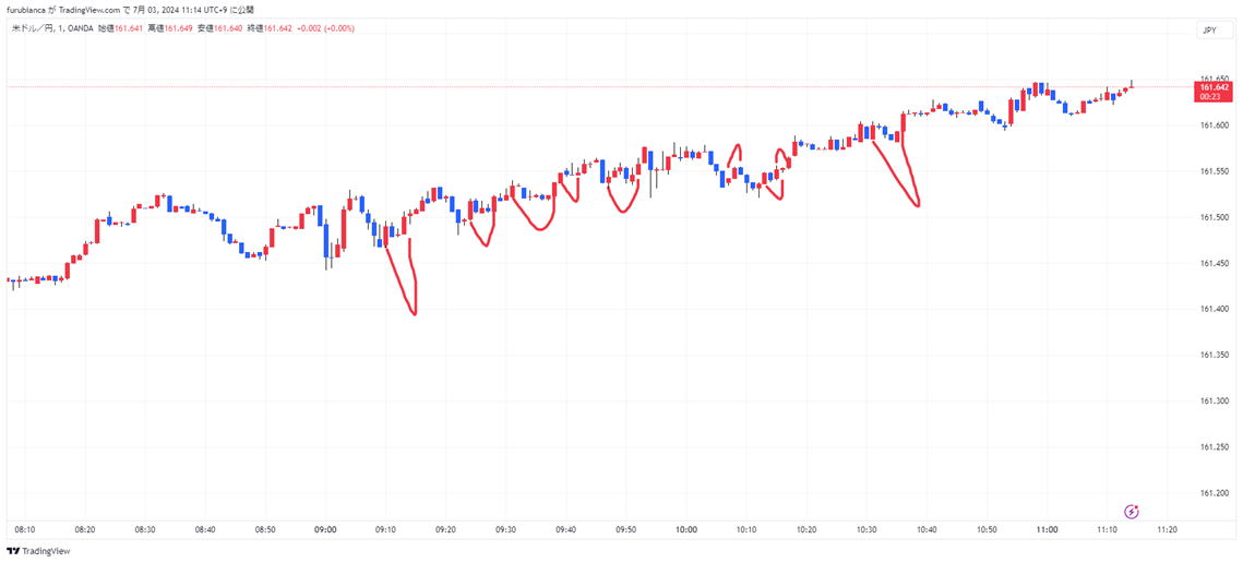 00現象 23:00指標発表 その他00分30分の時は、ロウソクが長い 23:00に多いが、その前の時間もある。 指標は、事前に時間くらい確認します。FX バイナリは一発勝負なので5分後に開始するといいです。 20分前に兆候がみられ、一種の出来レースの様子です。 キリ番(きりのいい価格例161.00)の時もある程度の変動があります。 |