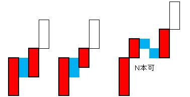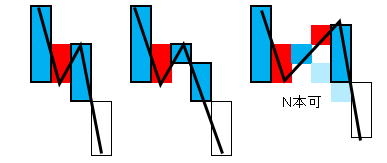 | 探す | トレンドがはっきりしているところで探してください。 差し込みの中の本数は、問いません。 上の図をイメージすると見えてきます。 リバウンドがおこる直前では、負けます。 仕掛けるポイント トレンドの方向性で見つけます。 水平線ブレイクの下あたりがお薦めです。 おおきく考えてもいいです。 |