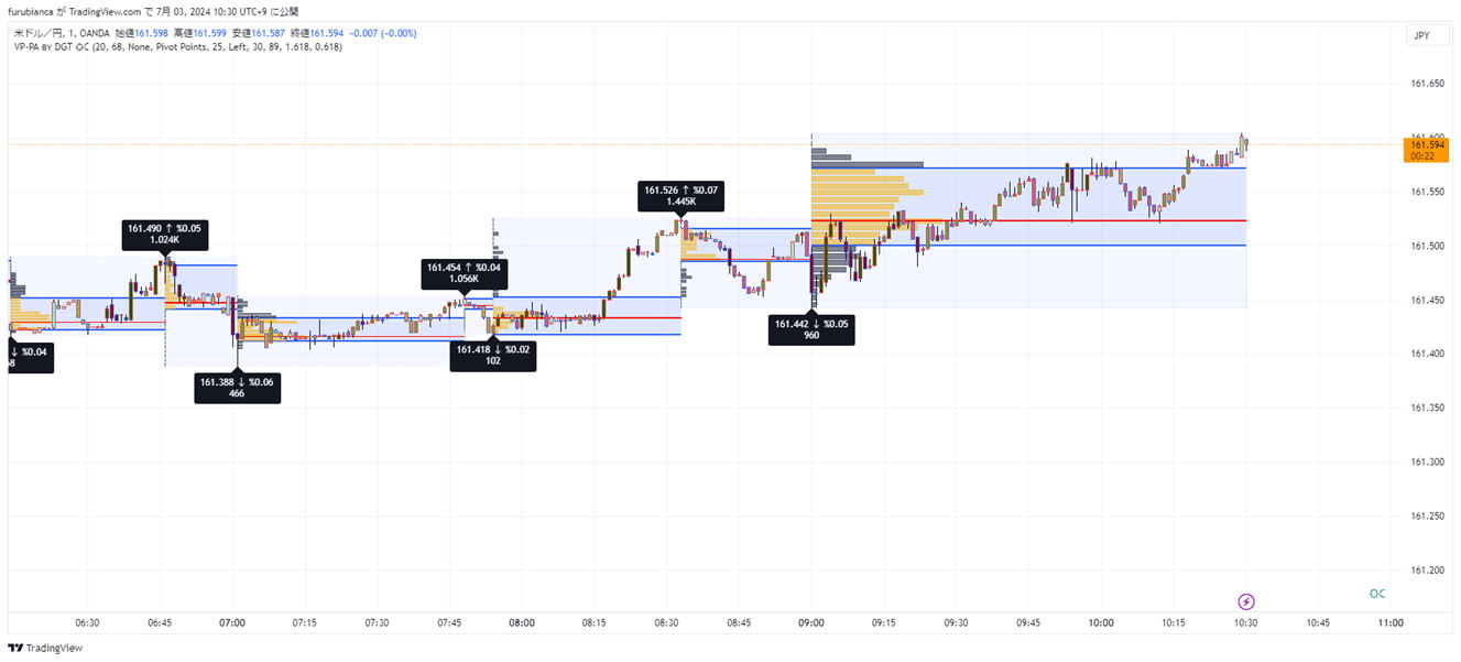 | 勢い | 5分足でも同じようになれば効果的です。1分と5分のトレーダーが増えるからでしょう。 ボリュームも入れてプログラム化すればより効果的です。 ボリュームのインジも入れると分かり易いものです。 トレーディングビューのVOLUME PROFILE、PIBOT ANCHORED BY DGTを入れてみてください。 大体レンジで多くなります。 ![]() |
