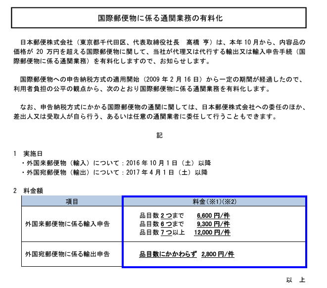 郵便局 ![]() EMSは新砂 EMS以外は、川崎 EMS、郵便局の航空便、郵便局の船便で日本に送る場合 荷物の損傷は保証できません。よって厳重に梱包の必要があります。 郵便局でも通関が、必要です。 通関の手続きは、 @通関業者に依頼する。 通関会社の基本料金は28000円からで、通関後は、郵便局が弊社まで配達してくれます。 通関業者が、持ってきてくれる場合もあります。 A郵便局に依頼する。 EMSは、江東区の新砂 東京都江東区新砂3-5-14 0120-5931-58 それ以外のSALは、川崎の国際郵便局に来ます。神奈川県川崎市川崎区東扇島88番地0120-5931-58 通関後は、弊社まで配達してくれます。100kg以下ならその場で引き取ってきます。 最初に、依頼します 郵便局に依頼する場合は最初に委任状作成を要求されますが、案内もあり簡単です。 20万円未満の申告ならば、基本料金は、一件200円でかつ1箱200円の手数料になります。 20万円以上の場合は、税関に大額申告を、郵便局に依頼します。 料金が改正されました。下記写真の通りです。 この方法は、書類の受け渡しと確認に2日間かかり、また許可後の配達も都内で2日かかります。(土日祝除く) B弊社が直接申告する。ほとんどこれです。 弊社が直接税関に行き、申告します。当日、貨物を引き取ります。 ダメージは保証できません。お客様立ち合いが原則です。 100KG以下なら車に積んで引き取ります。 手数料 別紙表のとおりです。 箱数が多くて100kGを超える場合は、この選択が良いと思います。 の3通りです。 |