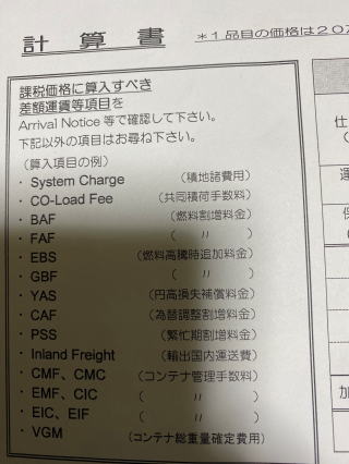 | 通関業務日当 | 8000円からとなっていて場所や所要時間で変わります。 お客様の都合で通関会社使用の場合は、通関会社に費用は直接お支払いください。 成田着のDO手配や船のDO(デリバリーオーダー)は、お客様が行ってください。弊社が行うと課金となります。 |