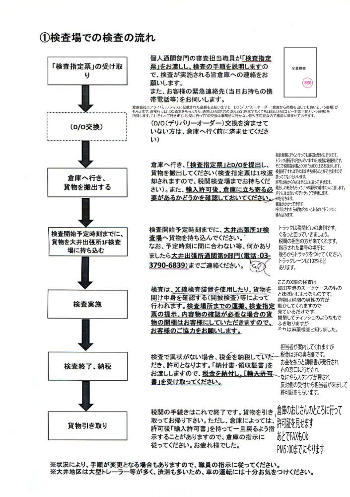 平和島![]() 城南島 ![]() 税関の手続き 事前準備 1、書類準備@ BL・インボイス、パッキングリスト、産地証明(ほぼ無くても可能) 商品説明書(化粧品の場合はワシントン条約に違反しないか)を用意します。 BLとは、ビルオブランディングといい、みんなビーエルと言っています。 荷積証明書のことです。 BLには、正式のものと簡易のものがあります。正規BLは、海外から書留で送られてきます。 BL・インボイス・パッキングリスト・産地証明・MSDS等のセットが3セット送られてきます。(やたらとサインや印鑑が押されています。) BLの裏側に会社名・住所・会社印、代表取締役名○○と書いて代表印も押します。 これをもって倉庫会社の最初の事務所に行きます。この事務所は港にはありません。 サレンダーの場合は、裏書は不要です。 飛行機や小額(どこまでが小額かの決まりはないが)の輸入では、正規BL方式は取らないのです。 サレンダーと言いまして正規BLは輸入者には送らず、荷物に添付して送ります。 よってアライバルノティスがBLの役目を果たします。 アライバルノティスは、絶対に無くさないでください。 ファックスの調子が悪く気づかないでいますと、相当期間が経過し、電話がかかってきます。倉庫代金も余分に取られます。 飛行機の場合は、テレックス書類になっていて、空港貨物事務所に行くとくれます。(郵便でちんたら送っていたら、荷物が飛行機で先に着きますので間に合わない) 2、書類準備A D/O取得 税関に行く前にDO(デリバリーオーダー)を取得します。倉庫会社もただでは動きません。 アライバルノティスがFAX(最近はメール)で来ますので、その案内の倉庫事務所に行き、お金を払います。倉庫じゃないですよ。 事務所の所在地は、港ではないので意外とビッくりですが・・・ 東京の場合は、だいたい中央区か港区か大田区にあります。 正規BLの場合は、受け取ったBLに裏書して一緒に事務所に持って行きます。1セット取られます。ボケっとしてないで2枚残しておきます。 支払いの内容は、製品代金以外の外国での運輸費用です。着払いなら運送費全部を支払います。 そこで、DOをくれます。新しい書類をくれる場合とFAXで来たアライバルノティスにD/Oのハンコをポンっと押してくれるだけの場合があります。 3、搬入確認 倉庫に荷物が来て、倉庫番号を割り当てられ、搬出する場所にセットされ、いつでも出せる状態にあることを言います。 この状態にないと税関に行っても申告できません。 BL、DO、インボイス・パッキングリスト書類を揃えて税関に行きます。 化粧品の場合は、製造販売業の許可証のコピー 各製品の届け出書のコピーが必要です。 商品説明書に写真と成分表を書いてこれも提出します。 倉庫会社で、デバン(コンテナからの荷卸しと棚への収納)が終わっていることを確認します。番号が出ていれば出荷OKです。 これを空港税関では当たりと言います。船の大井に行って当たりが出ましたかと聞いてもわからず、搬入確認と聞いたらわかった様子でした。 アライバルノティスが来たからと言って、余り早く行きますと当たりが無いので申告ができません。 最近は、倉庫のインターネットでわかるようになっています。しかし、アプリがうまく稼働せず電話してくれと言われることもあります。 4、税関に行く 大井出張所では、個人は3階です。いつもガラガラです。最近(20200722)は、飛行機がダメなせいかちょっと混んでいます。 4人位で満員ですから、知れています。2023/02に行くとコロナ対応となって仕切られていました。 職員は20人くらいいます。 私も過去は通関業者に頼んでいましたが、ここまで個人で通関にやってくる人はあまりいないんだなあと感じました。 やってみての感想は、すごく親切です。頑張ればちょろい!! 申告は、パソコンでやります。NACCSナックスとかキオスク端末です。 初期画面で海上輸入申告を選びます。 すると、BL番号を入れて送信します。番号が合っていれば、申告内容入力画面になります。 税関ごとに貿易形態の分類コードを入れますが、そこだけ違っていて他は、どこの税関に行っても共通です。 分からないことはそこで調べてもいいですが、慣れない方は、係員に聞いた方が早いです。 CIFに加算金額がある場合は差額を選べばいいです。それも教えてくれます。 以下の写真は、課税対象運賃の内訳です。素人が見ても分からないですね。 大井では○をつけてこれはここに打ってと言われます。成田では2人がやってきて全部指さしで教えてくれます。 日本で運賃を払った場合は、単位は円となります。ドルで間違うと運賃が300万円になるので注意してください。 行く前に全部の費用の1割が税金だと金額を確認していきます。 アライバルノティスかDoを係りの方に見せますと、「これとこれを合計してください。」と教えてくれます。みんな優しいです。正規インボイスでいくとなんだか堂々とできるので気が楽でした。 検査 何でもかんでもす