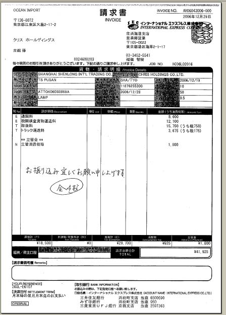 コンテナ運送料 ; ¥73,000./20FT,東京港〜×××(課税)