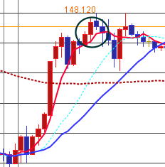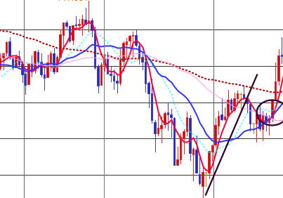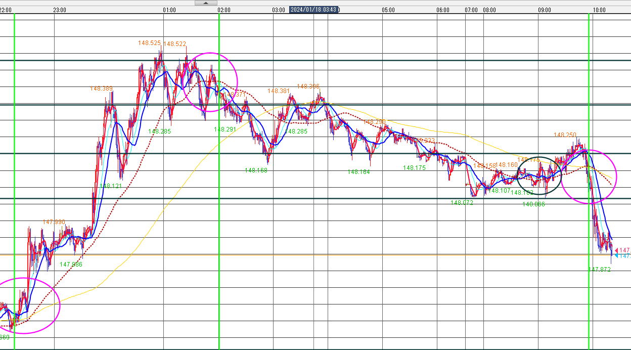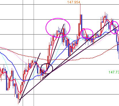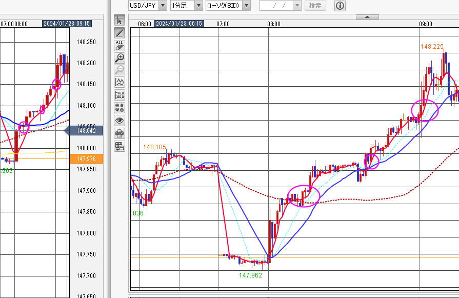 | 手法 | 完全なパーフェクトオーダーは短命かも知れません。でも1分足では出ていないが、5分足など一個上の大きいチャートだと綺麗に出現したりします。ブレを吸収するからです。 パーフェクトオーダーが出たら、一分足チャートを見て、ロウソクが、5MAを抜いたら、エントリーしていきます。 パーフェクトオーダーが出たからと言って、一回もできないこともあり、長ければ5回もできます。 トイレンドの最後に、レンジ突入か急反発するとそこでは、たぶん負けてしまいますがすぐに決済してください。 以下の画像は売りの場合です。買いはその逆です。 ![]() この時は安定した相場ですが、1分足では流れの中で売り買いが行われています。 その中でもロウソクの5MA抜きが発生し、そこが追撃エントリーとなります。 買いの場合は以下の通り 赤丸の所で追撃か、エントリーします。ブレを逆に利用します。 5分足では追撃信号が無いが1分足ではよく出ます。短命の時もあります。押し目が弱くカウンタークロスしない場合 一発屋のパーフェクトオーダーの時もあり、ルール通り追撃して失敗した例 ここで買いを入れて撃沈 最後の兆候もありますがなかなか気づきませんね。決済は、5MA手法と同じでトレンドラインインフィールドを引いていきます。 インフィールドならホールドキープ ブレイクなら決済、または、5MAでも21MAラインのブレイクかタッチ、大きなプライスアクションで決済します。 ここの部分は各自の判断とします。 完全なパーフェクトオーダーというのはめったに出ませんが、 似たような形が出ればそれに準じます。 最初は細かくやって細かい勝を拾い、慣れて来たら21MAか45MAまで我慢しますが それはここでは記載しません。 ![]() 左5分足ピンク丸で 右1分足 |