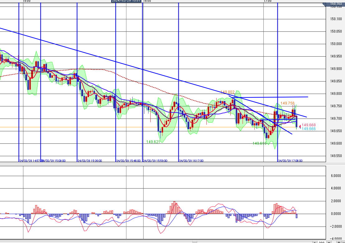 パラボリックも組み込んでありますが、緩い上昇のレンジトレンドで大きなロウソクもあります。 ロウソクでのエントリーチャンスとパラボリックの相関関係が使い物になりません。 階段線もほぼ全部貫き こういう場合は無理してエントリーポイントを探さずも良いと思います。 やる気満々なら、ボリンジャーバンドの端にタッチしたノイズを見つけ、そこから戻ったら その時点でほぼ確定した時か次のロウソクを00秒で、センター戻りの方向で。1分エントリーします。 エントリーは一回のみです。 トレンドラインでもブレイクが明確ならエントリー一回してください。 焼き鳥一本相場は見るだけでエントリー禁止です。流れるのを待ちます。 待てば海路の日和 ひよりあり 待ってりゃ、10分20分でもっと良い相場がありますよ。 これを見て、これじゃあ勝てないな 勝てるとしたらここだけだかな と思えるようになってください。 |