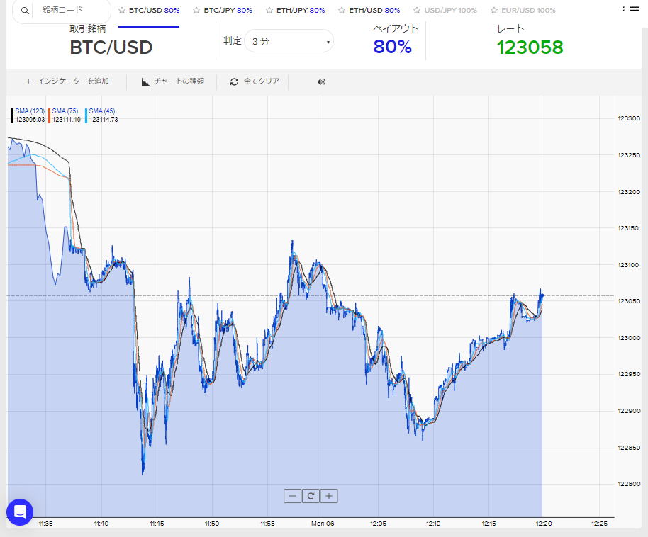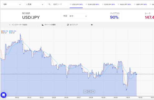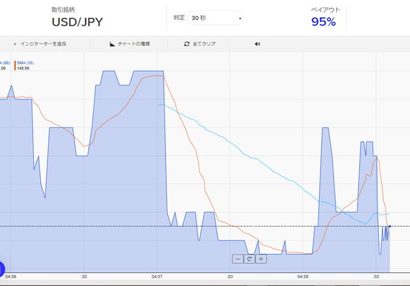 | 15秒エントリー | センスが必要です。センスとは相場の流れから一瞬でエントリー時間を判断する能力です。 3分では勝てずも15秒で勝てそうな時がたくさんあります。 負けると15秒で取り返せることもあるが、うまくなってからにしましょう。まあやらない方が良いですが。 勝ちやすいのですが、調子に乗らないと分かってもごっそり負けるんです。 |