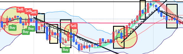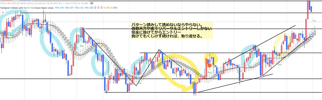 | 先に普通チャートを見よう。 勝てる相場 エッジ相場 ![]() 見るべきポイントは、ダメな場所とやるべき場所を見分けられることです。 ❶ダメなポイントから先に解説します。 ①焼き鳥相場 ![]() 理論的には上に弾んだらLowエントリーですが、0.3秒位で余りにも短時間のチャンスしかなく、滑ったり、約定拒否でエントリーできず思わず2度押しエントリーでやっぱり滑ると もう勝てません。静かに負けを待つのみです。 20MAや階段線にロウソクが、かぶっている部分 レンジと言えばレンジですが階段がろうそくを串刺ししています。 まるで焼き鳥 横滑りすると20MAでなくも串刺しか沿うような形になります。 勢いが定まらないので上下ゼブラロウソクの連続性は、なく、不安定な相場です。真横に進むと泥沼です。 傾斜が見られるようになったら、長めのエントリーでも勝てますが、判定期間を待っているうちに反転してよく負けます。 パターンが出ればエッジで勝つこともできます。しかし短命なので一回のトレンドで一回エントリーをエッジでエントリーします。 あまりお勧めしません。負けるリスクの所は攻めなくもOK それよりじっと待つ訓練が大事 焼き鳥は 焼けるまで待とう ブレイクを FX季語の俳句です。 簡単です。階段ラインがろうそくと交差する時は、エントリーしないで待ちます。 ⓶レンジ レンジには、上下に距離があり、普通サイズのロウソクが、5本以内ならエントリーはしない方が良いです。 前回クラスタートレンドのロウソクの本数が少なくも6本以上でやってください。 トレンドの後は、きれいなトレンドというようにはなりません。あったとしてもそれはラッキーだと思ってください。 トレンドの後はレンジだと思ってください。上昇と下降がぶつかり合って不安定になり、しばらくしたら方向が決まるとなります。 この不安定な場所でエントリーすることは、死を意味します。やったと思っても一分後反転して負ける。 レンジにもいろんな種類があって1本レンジから長いと一時間も続くものがありますがコアタイムにやれば長いレンジが出る確立はは低くなります。 夜中の2:00過ぎにもこうした長いレンジがよく出ますがそんな時は寝るか、貨幣以外の仮想通貨や金の市場へ行きましょう。 ゼブラ相場なら、パターンを読んで一兆行けるかと一回二回勝ってけるかも知れませんが、突然パターンが崩れてこの先やると負けます。 何回やってもあっているのに負ける現象が起きて結局は負ける。勝っても55%なのでやめておけとなります。 片道ロウソク9本のレンジなら、バイナリでは勝負ができます。(5分は無理かな) ③レンジトレンドの向きとは逆の向き 言うまでもないですが、トレンドラインブレイクしていない反転押し目でエントリーすることです。 釣られてエントリーするアホにならないでください。 15秒等の短時間エントリーで勝てますがせいぜい1回 エントリーはトレンド内一方通行逆走禁止 長い時間のエントリーがゆうこうです。 ![]() 四角い場所のことです。 押し目と世間的には言います。すぽっと的な利食い部分です。 赤い矢印部分は逆走部分です。階段線と逆向きにロウソクが推移しています。ダメな理由は短命でまたいつ順目になるか分かりません。 ①⓶のまとめ ★★大事なところは階段線から離れてだしている。階段線とはの方向の通りのエントリー HighLowチャートの時間感覚と一般チャートの時間でパソコンの画像の幅のそれぞれの間隔を体得してください。 理にかなえば、短くもエッジが出たら短いなりに15秒や30秒でチャンス一回で勝負することもできますが普通の方はパスしてください。 何だあ?勝っていたじゃないかって我ながら思うことも有りますが我慢してください。あるある話です。 やってないのにやってたらなんで思っちゃダメです。パターンの読み違いの時間ミスエントリーです。 下降のエッジが出たからLowエントリーを1分や3分でやると負けます。 トレンドが上昇なのにLowエントリーはしないということです。下降はその逆です。 負けたら不安定でありパターンを再確認してください。 ![]() |