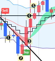| 利食いの陰線が出ると階段線に近づきますが 流れができれば❻❼を起点で順行します。 ❽でエントリーします 2回目以降のエントリーは00秒の1分エントリーをお薦めします。 HighLowチャートに慣れてエッジの方が正確だと感じる方はエッジエントリーしてください。 |