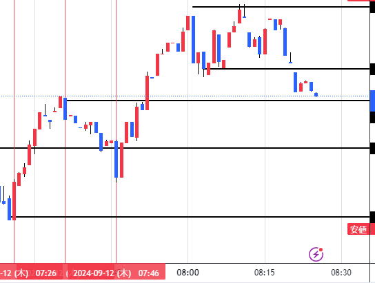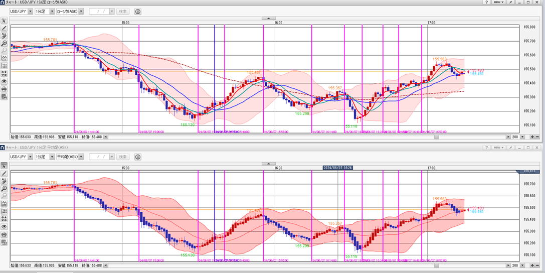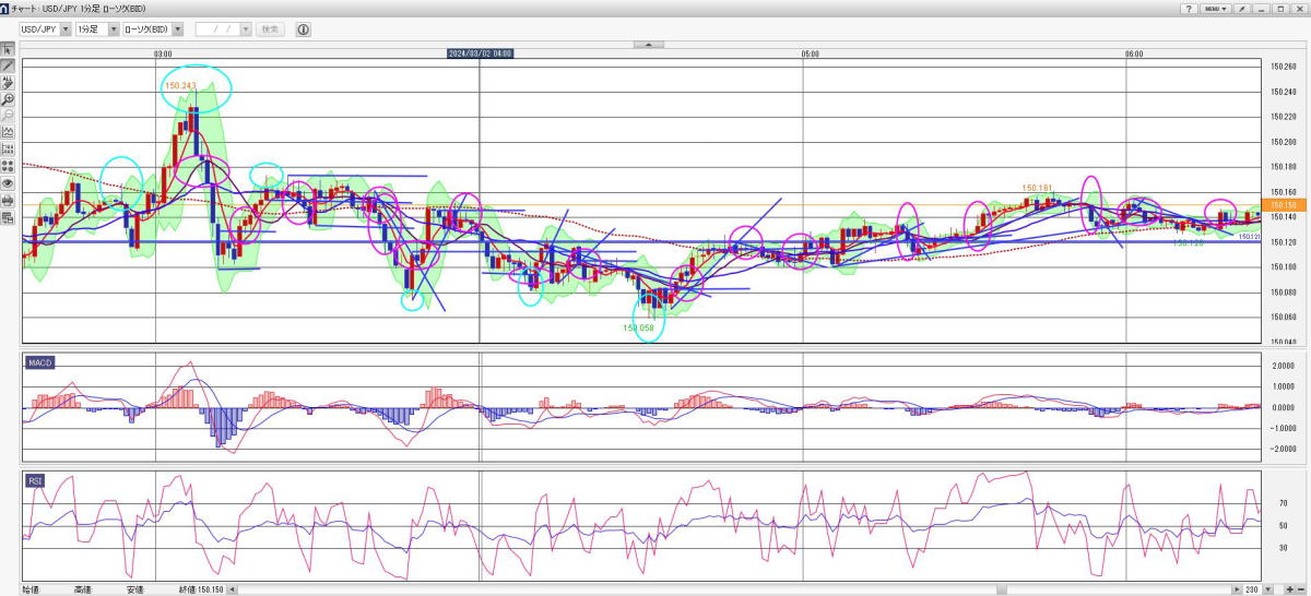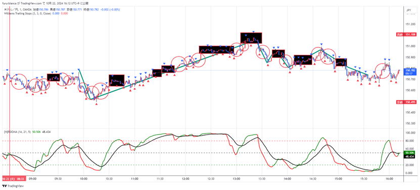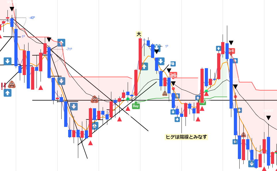 平均足で3分でエントリー ロウソクの足を一本ずつ判断してエントリーすることは難しいと感じます、ブレですね、 ここで平均足を使って超簡単なトレードを紹介します。平均足を連続でとらえることによって方向性を失わずにトレードができます。 基本ルール 平均足チャートを出します。ノーマルチャートも同じように出します 4連続以上の同じ色のロウソクが、変わったらその方向にエントリー 50秒エントリーします。本来は次の足ですが、00では滑る事があるので色の確定がほぼ45秒で決まることが多いからです。 例 赤赤赤赤青=>エントリー 青青青青赤=>エントリー 例外その1、前の色が3連続以下かシングルの場合は、反対の色が2連続すればエントリー この時水平線はブレイクしていることを確認 例 赤(赤)青青=>エントリー 追撃ルール ロウソクの縦幅が短くなったらエントリーすると負けるが、逆に長くなれば、順張りで2発エントリーします。 ![]() 20240607 PM14:30- ブレというだましには、負けます。がしかし、全体から見ればそんなでもない。 上記の相場でPM14;30~PM17:00までで 押し目追撃をカウントしないとしたら、14回やったとしたら負けは、3-4回くらいです。 たまたまですが、検証は少なくも5回はいろんな相場で試してください。打率は自分自身で検証してください。 |