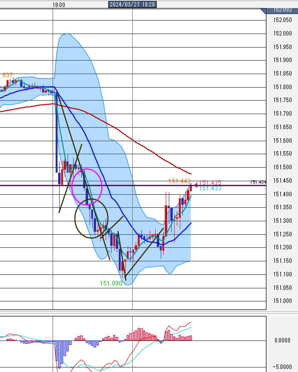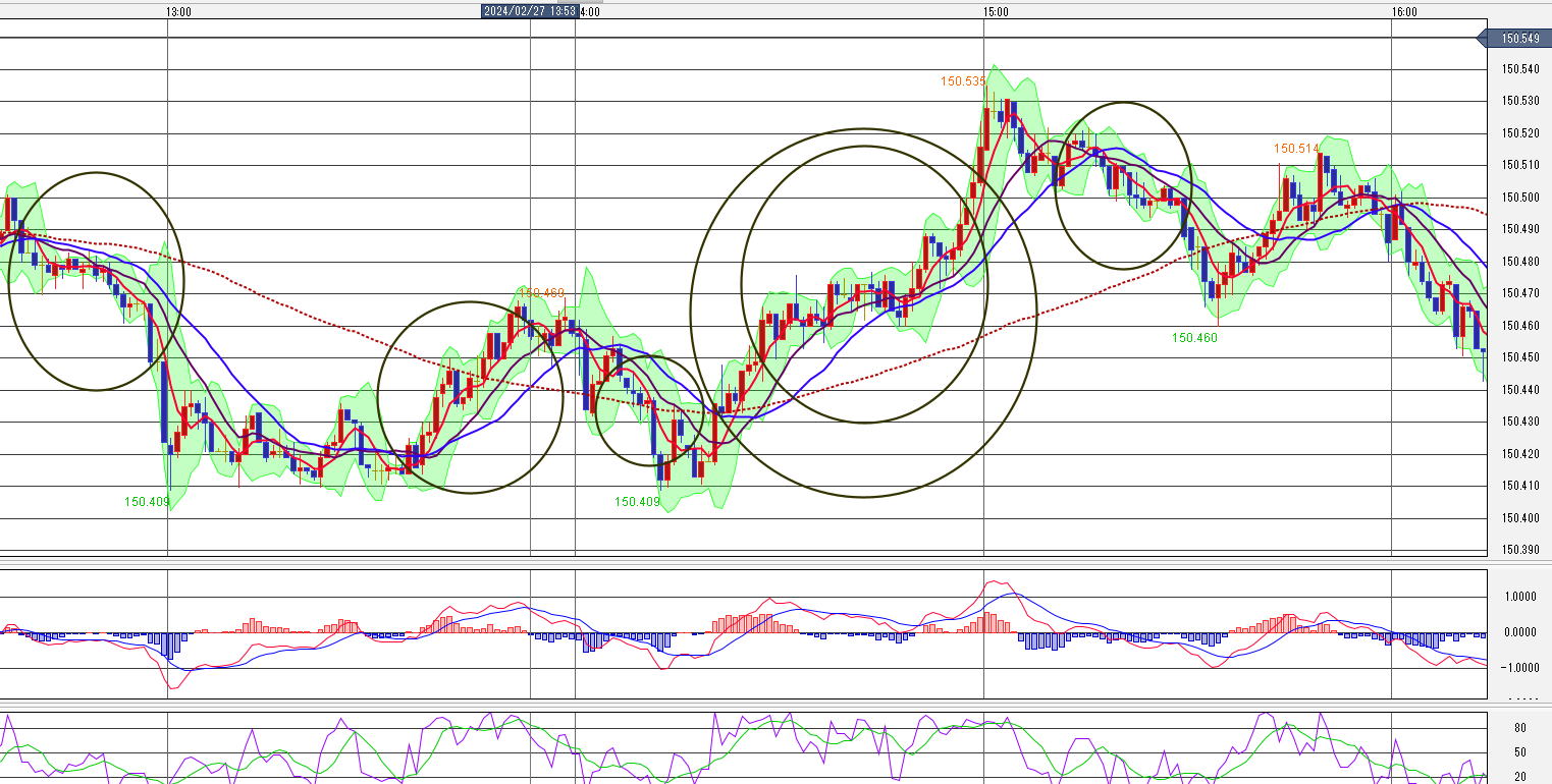 パーフェクトオーダーは、個人のMAの数字設定でも変わります。 あまり細かいとろうそくに引っ付き、長いと花®てしまいます。 ![]() パーフェクトオーダーは、個人のMAの数字設定でも変わります。 あまり細かいとろうそくに引っ付き、長いと花®てしまい 二番目の○は、準パーフェクトオーダーです。長さのそろったろうそくです。MACDのピラミッドを見ると、フタコブラクダです。ロウソクは押し目の反発、ここもHIGHのエントリーポイントです。 なお二回目の押し目は、エントリーしません。トレンドっていうものはN波形なので第五波を取ってしまうとその先は頂点なので、5分エントリーすると負けちゃうか、ギリで勝つかです。勝率50%ならやめるべきです。 三番目・五番目も準パーフェクトオーダーです。 三番目は4波5波無し。五番目は、N波形が出て最後は、ゴールダッシュ ここは、てっぺんじゃなく、中の上層なのでダッシュ一回目までならエントリーしても良いかなとも思いますが反発が緩いので勝でした。 一番右のトレンドの山もてっぺんレンジを除けば、パーフェクトオーダーです。 パーフェクトオーダーと言えども、安心して調子こくと、レンジ沼にはまって、さあ大変じゃなく負けで資金没収となります。 |