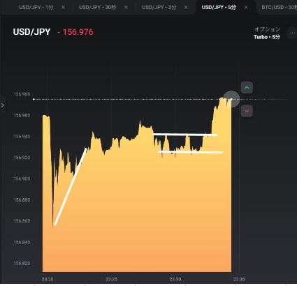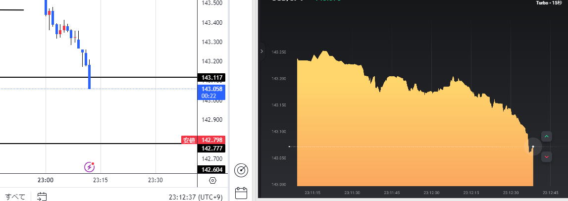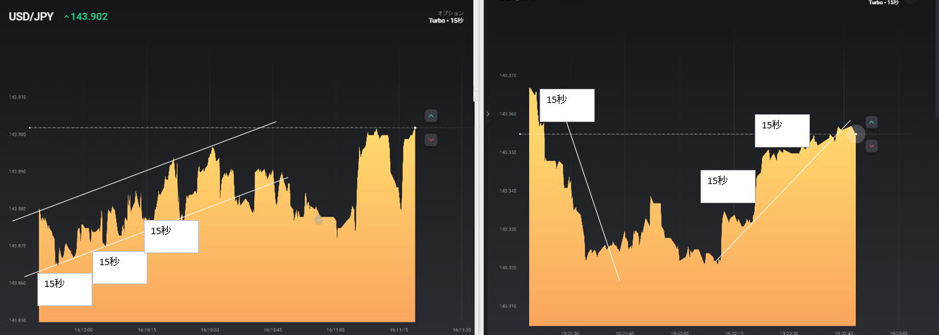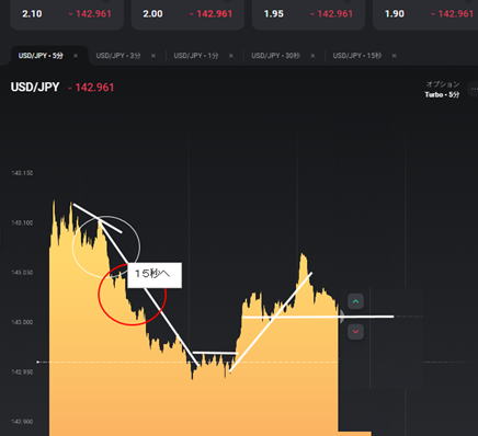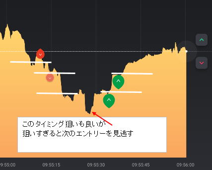 | エントリー時間使い分け | エントリー時間使い分け 15秒ではブレで負けたので3分に切り替え 大きな流れに乗った感じです。横滑りも長いので負けます。 無理に時間を変えず待つのも手段 |