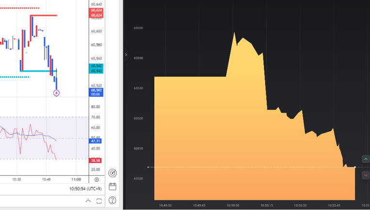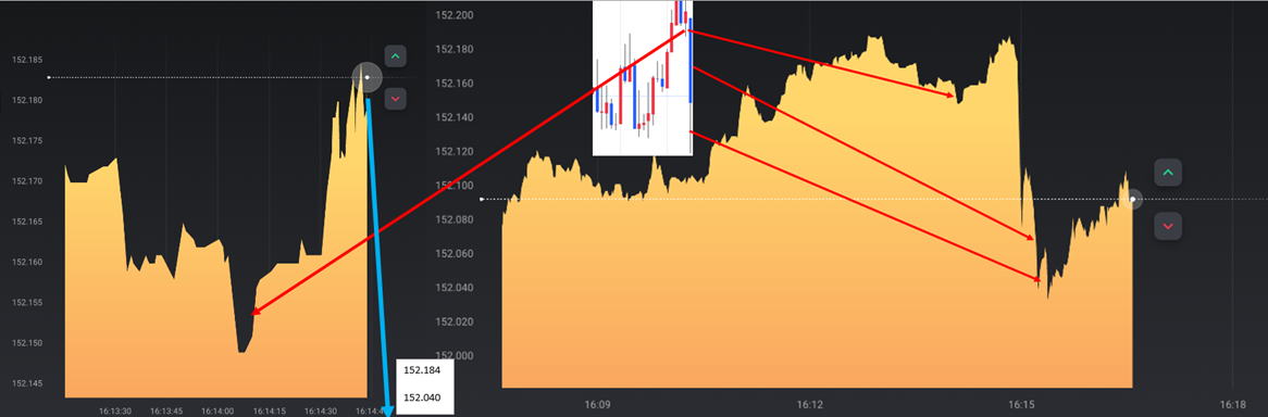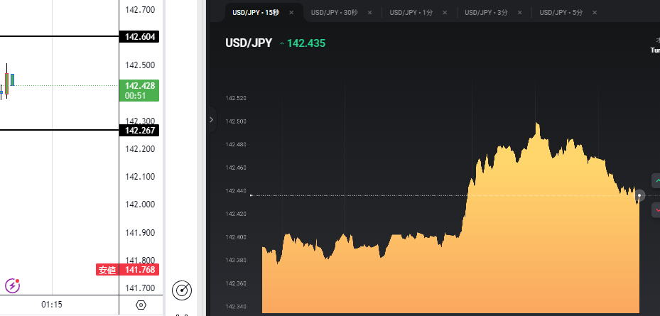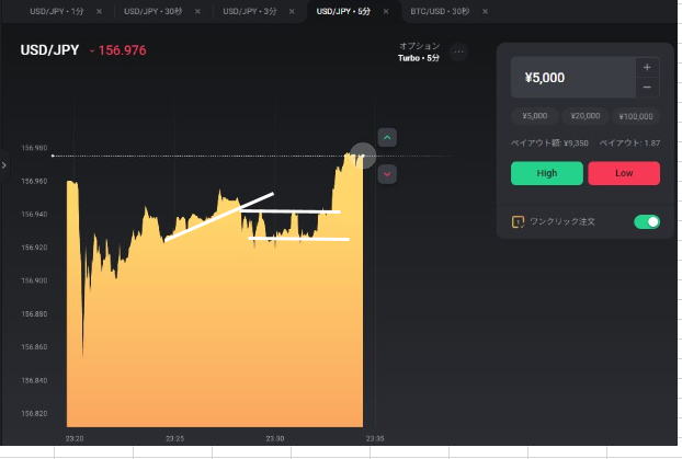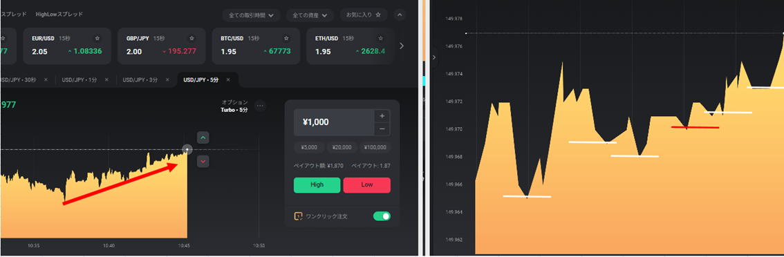 | 5秒チャートで勝てるか? | 5秒チャートを見てハイロー15秒は勝てるか? 結論:これを見て分析にするのは、素晴らしいがエントリーポイントはハイローで15秒エントリーするとタイムロスが発生して勝てません。 やるなら30秒以上です。 |