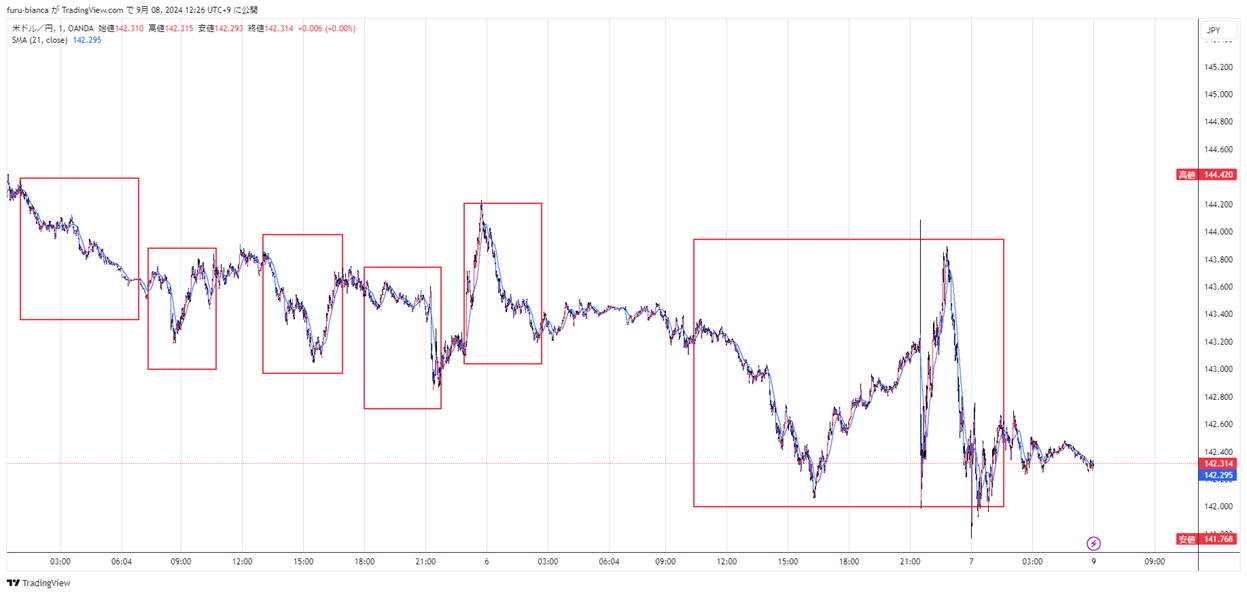 連打できるBIGトレンドが発生する時間帯を調査してみた。 5分足です。2024/2/24~2024/2/27 ![]() 連打できるBIGトレンドが発生する時間帯を調査してみた。 5分足です。2024/2/24~2024/2/27 20240605 ![]() 我々アジア人が起きて活動する時間って儲からないんです。不安定だし、損する民族日本人って感じがしてきました。 まあ朝だけ たまに昼からですかね。 一日の中でトレンドが何回でるかって数えると、連打チャンスは平均6回です。 まあ夜の8:00からっていうのが、ぜんぶじゃないけど、やけに長いのでチャンスも長いので、ずば抜けてすごいですよね。気合い入れる時です。 ちょっと前は深夜はべっちゃんこでしたが最近は動いています。 私のへっぽこ分析でどうこう言いますが、自分でもこんなことやってみてください。 |