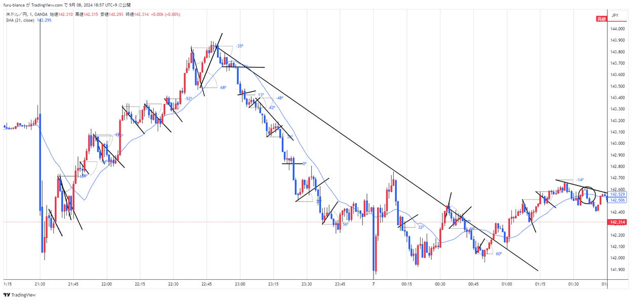 一般チャートで大きめに見ます。 終わった後ですがこの日はレンジが少なかった。 長いトレンドは何と言っても、レンジからの水平線ブレイク レンジが来たら根気よく抜けを待ちます。 山高ければ谷深し 谷深ければ山高し ![]() 相場の向き 簡単に21MAでもOkですし、他のインジケータでも、目視でもOK 反転の方がなだらかでやりやすいこともあります。90分トレンドには表と裏 裏と表ああるように感じます。 裏裏もあるし表表もあります。 現在が、上昇か下降か横向きかを判断します。トレンドになっていることが条件です。 終わったチャートだからなんでも言えますがここから学ぶこともあります 21MAで上昇していますが調整押し目で戻る場合もありますのでご注意 MAは絶対じゃないがタイミングを見るにはいいです。 90分トレンドが続きました 角度ないですが・・・ 剣のようなブレはトレンドでは無視 むしろ反発チャンス |
