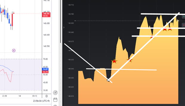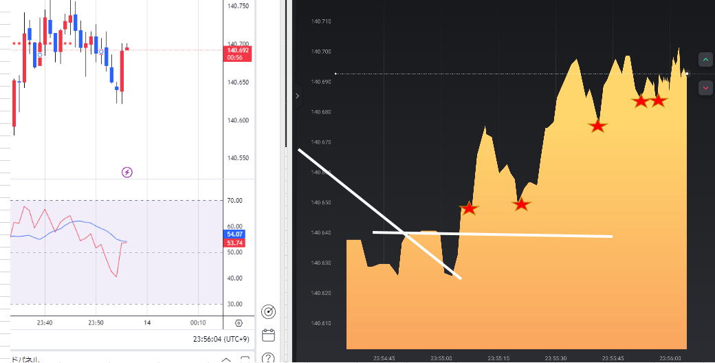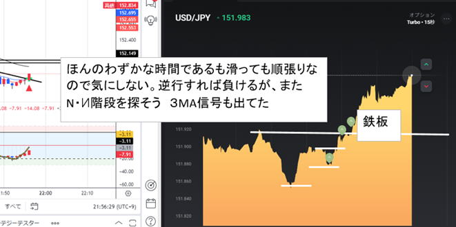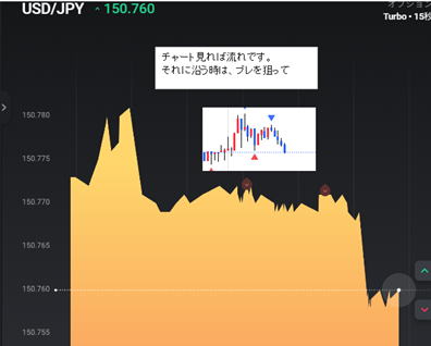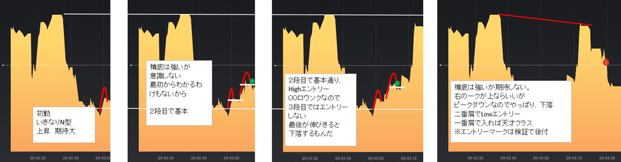 安値高値の位置関係で階段が出たら N型になった瞬間である二段目を狙い、ここでエントリー トレンドがはっきりしていれば1段目で狙ってもいけます。 ![]() 一段目では、下げ上げでは分からないので二段目になる。 3段目が順行する確率は絶大です。 三段目では、利食いの反発があるので止める。 ペッタンコになったらリセットして次の階段の出没を待ち、二段目でエントリー 下記は5分ライン真ん中がリセット ![]() 20:47分でペッタンコ リセット 20:56でペッタンコでリセット ラインチャートではどんと落ちたがこの後はうなぎ上り慣れれば一般チャートを見ないでも行けそうな ![]() 反転の瞬間 ![]() ばたばたしていると負けます。坊主ロウソクが良いのですがそれを予測する術はないですが、階段になっていればほぼ坊主 ひげが一般チャートで上下に出れば不安定なのでラインチャートでも勝てません。 階段途中にブレで負けますが、フラットリセットして次の二段目を待ちましょう。 そのうちドル箱相場が来ますのでそこで取り返しましょう。 レンジでもできますが雰囲気をつかめば勝てますが連打不可です。 ![]() ![]() ![]() ![]() ロウソクでひげが出て順行しそうなら、階段が出ますので基本通り二段目で15秒Highエントリー 横滑りが10秒以上続きそうな時は、小さなブレで負けます。勝てませんので静止するしかないです。5分はエントリーどころじゃない。 駒が連続する時も同じで階段待ちです。 フラットの形より少し激しくなりますとくさび型で動きます。フラット階段と同じ原理で、この相場はフラットより強く長続きします。 もし1分チャートなら、2倍はエントリーしちゃっていると思います。 15秒なら連打しまくりかな。 ![]() ![]() |