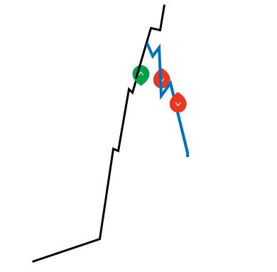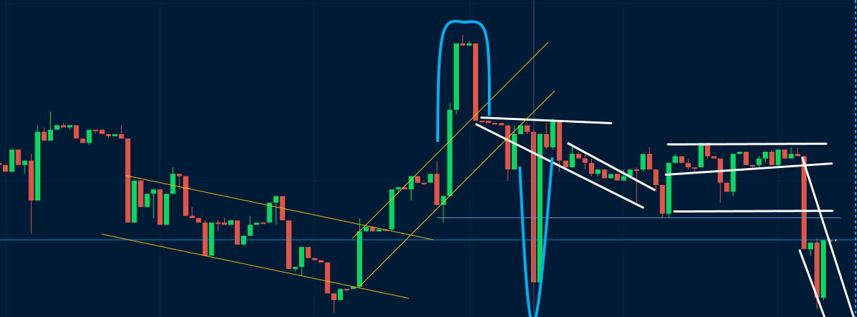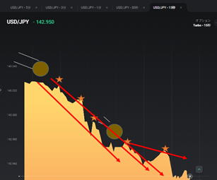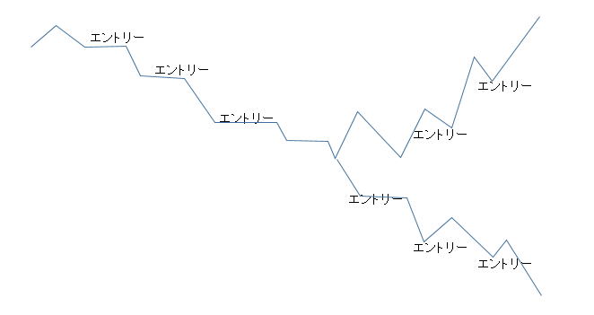 階段エントリーで方向性の迷いが出たら 方向性が分からないとエントリー方向が分からないです。 上か下か中か分からない時 こういう時は、尾根線(下降ちゅう)から谷線(上昇中)へ谷線(上昇中)から尾根線(加工中)のトレンドラインを連続して引きます。 スライドしたら横線でつなげばいい。天井は、/\か、/‾‾‾\、 底はVか\_/となります。実際には引けないのでイメージです。 短くも長くもありますので、水平線も考えてイメージします。 バタバタしている時は、1分3分のエントリーに変えるかエントリーしません。時間幅とタイミングは大事です。 見た瞬間に勝てる勝てないを判断できるようにしましょう。 三角相場になったと感じたらレンジと同じように抜けるのを待った方が良いです。下図左半分。 ![]() |